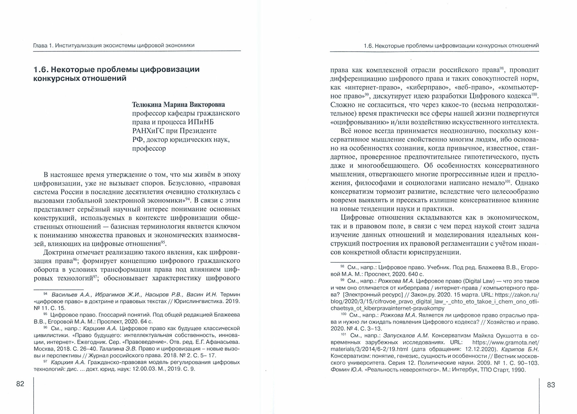 Коллективная монография подготовлена участниками международной научно-практической конференции «Проблемы создания цифровой экосистемы: правовые и экономические аспекты», организованной Московским отделением Ассоциации юристов России, Управлением международного сотрудничества Университета имени О.Е. Кутафина (МГЮА) и кафедрой предпринимательского права МГУ имени М.В. Ломоносова 2 декабря 2020 года в рамках проведения X Московской юридической недели, и посвящена актуальным вопросам правового регулирования цифровой экосистемы на современном этапе развития общества, в том числе ее институализации и правовой конфигурации, бизнес-экосистемам, цифровизации конкурсных отношений и управления финансами, антимонопольному регулированию цифровой рыночной инфраструктуры.