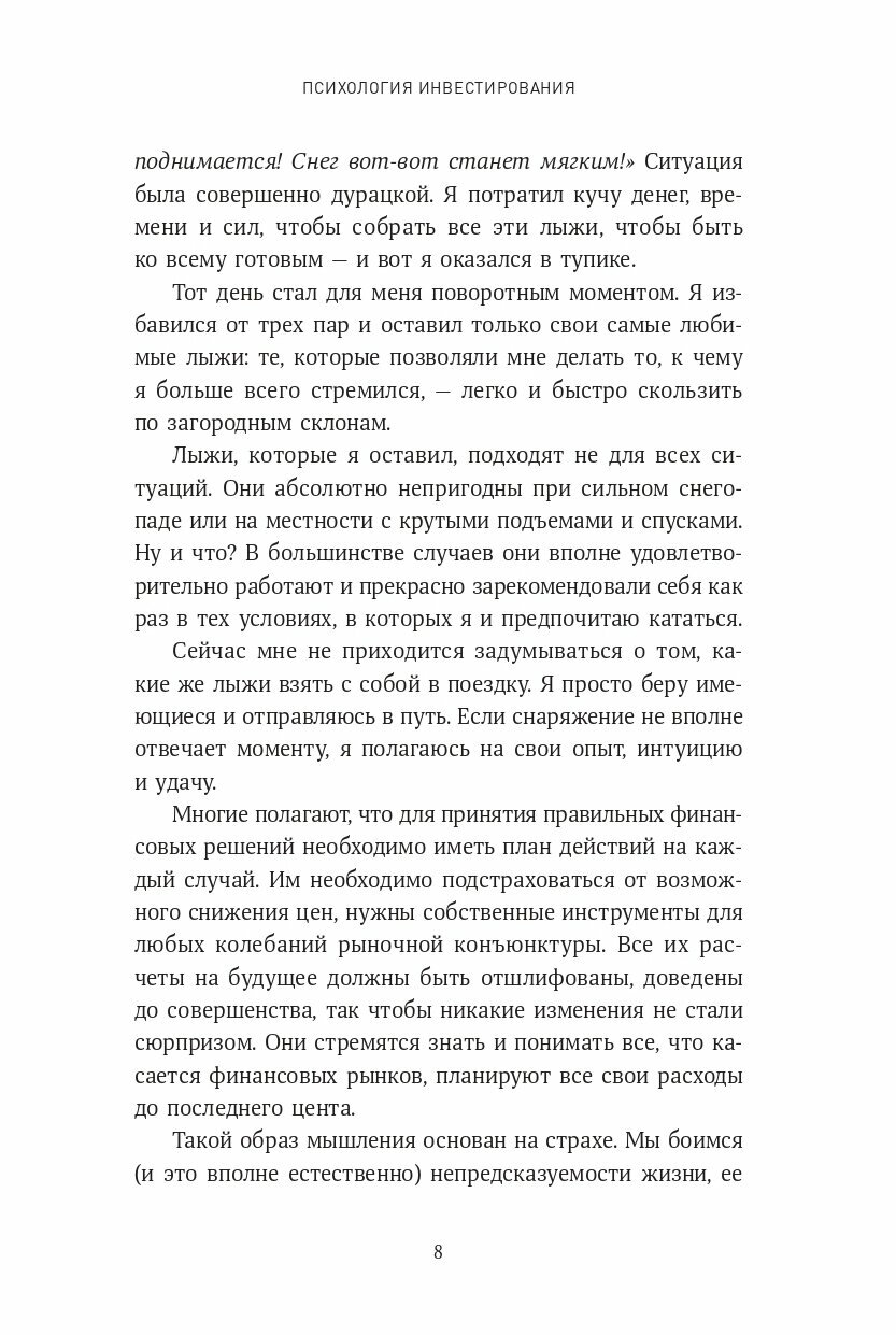 Если Вы занимаетесь инвестированием, эта книга обязательна к прочтению. За 3 года моих личных инвестиций я понял, что мои когнитивные искажения и психологические пристрастия лишили меня сотен тысяч дохода и кучи времени. И эта книга отдельно и внятно разбирает каждую типовую проблему частного инвестора. Каждая типовая ошибка проиллюстрирована поучительной историей. Автор пишет для американского читателя, поэтому всё изложено очень доходчиво просто, как для детей. Подтверждаю, на примере личных ошибок, что автор верно расставляет акценты: на рынке мы зарабатываем не за счёт каких-то особых знаний и инструментов, а за счёт того, что перестаём делать типовые глупости, обусловленные механизмами нашей психики.