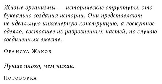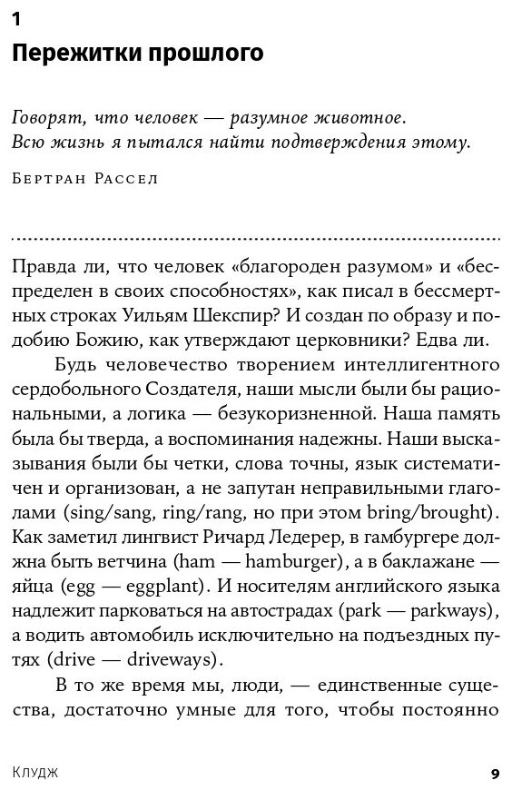 Человек привык считать себя венцом творения, свои сильные стороны — нормой, а слабости — отклонением. Подход автора принципиально другой: мы изначально несовершенны; наш мозг, как и тело, в ходе эволюции формировался достаточно случайно, из «подручных материалов» природы и являет собой так называемый клудж — нелепое, неуклюжее, но удивительно эффективное решение проблемы. Понятие клуджа проливает свет на важные стороны нашей жизни и объясняет множество проблем, с которыми мы сталкиваемся. Выводы автора оптимистичны: имея должное понимание соотношения сил и слабостей человеческого ума, мы получаем возможность помочь не только себе, но и обществу.