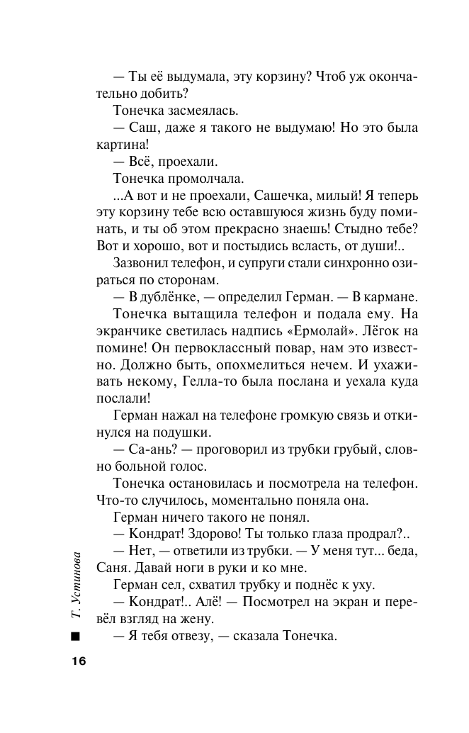 Легкая современная история, написанная сочным профессиональным языком. Главная героиня - сценаристка Тонечка, редкостная обаятельная тупица, какая-то нехарактерная неустиновская героиня, этим, наверное и интересна, ввязывается в расследование вопреки запретам мужа и полиции, но все как всегда заканчивается хорошо.