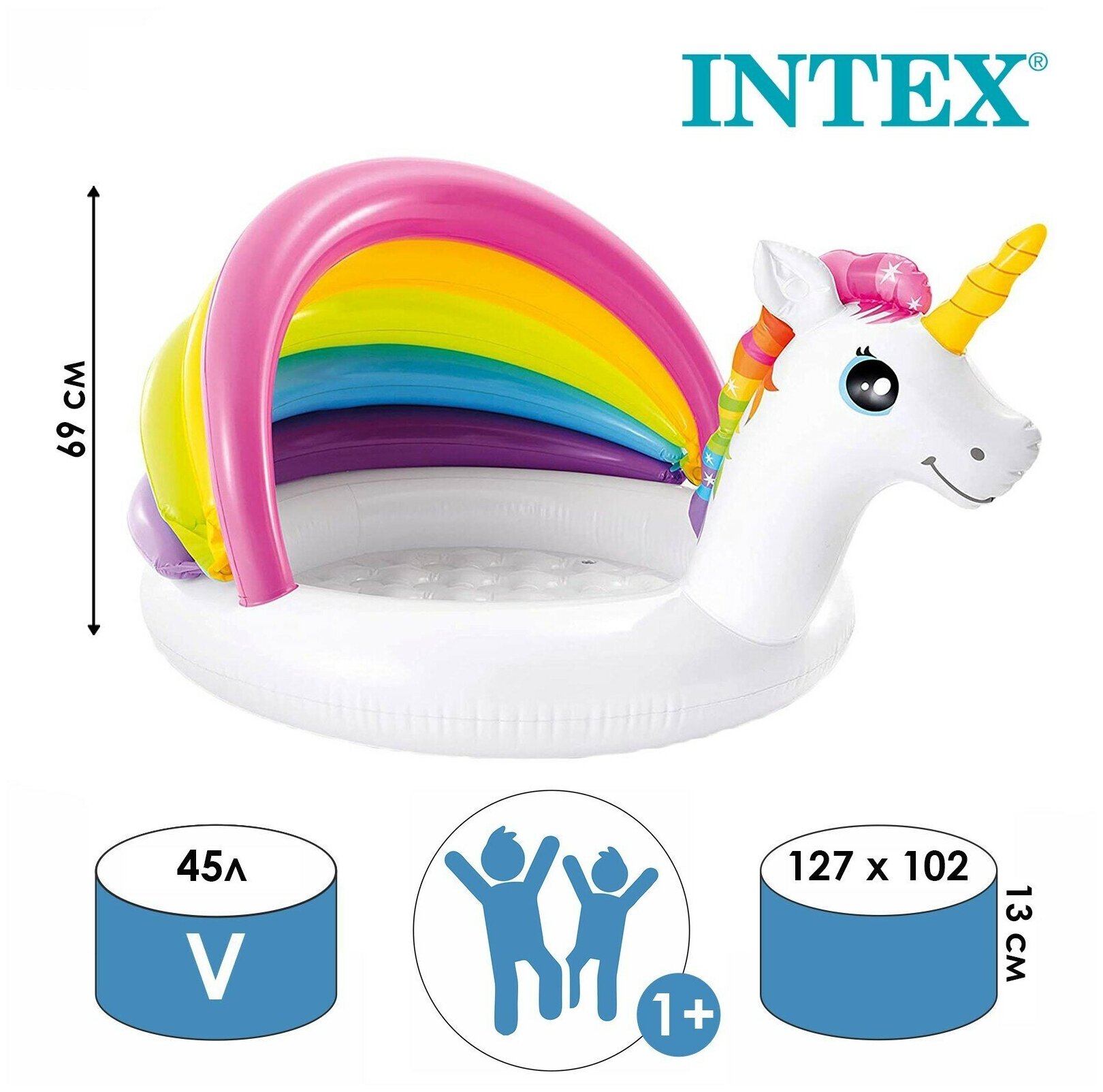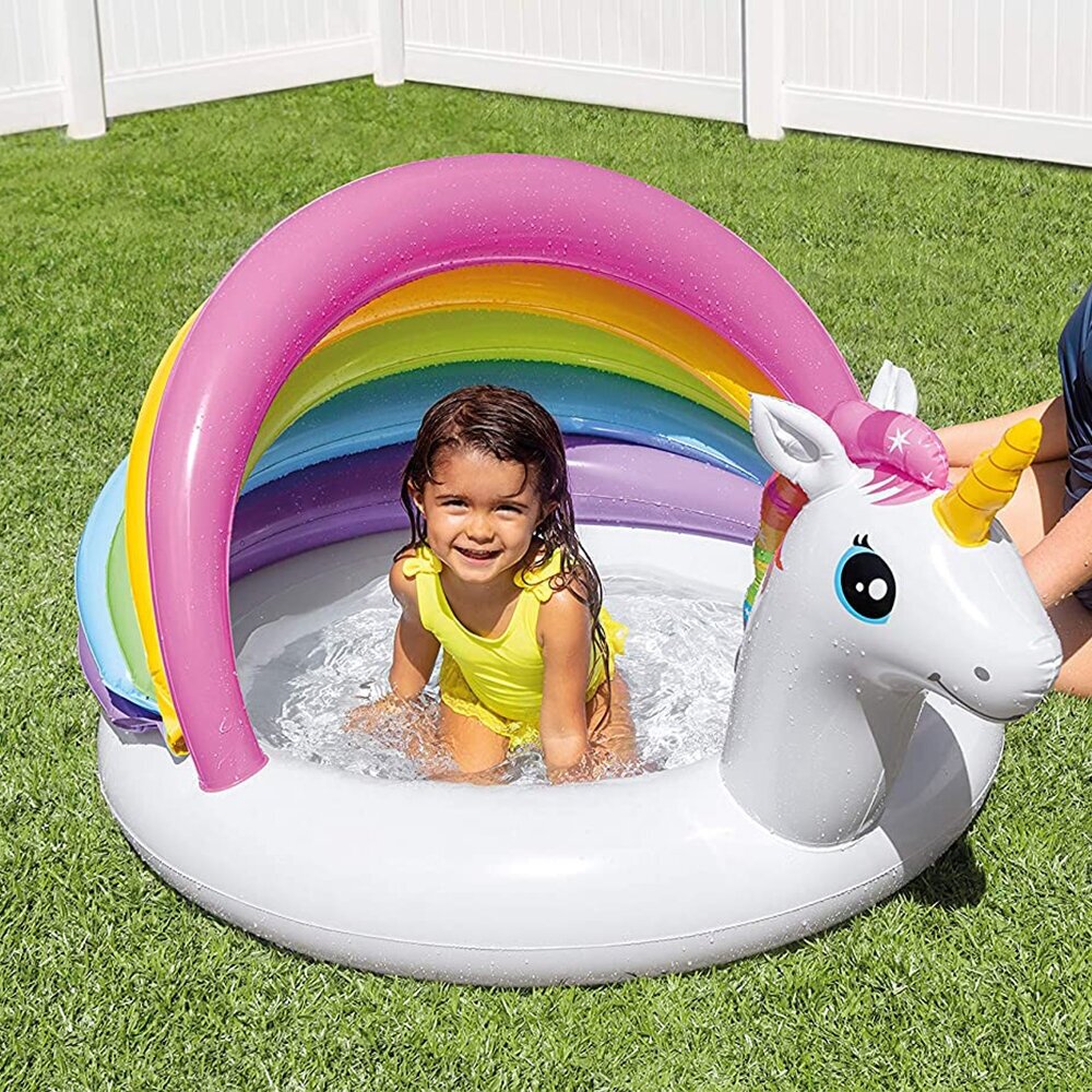 Яркий бассейн "Единорог" не оставит без эмоций ни одного ребёнка. Бассейн имеет встроенный фонтан-распылитель, для работы которого достаточно присоединить садовый шланг. Изготовлен из винила толщиной 0,28 мм. Имеется сливной клапан.