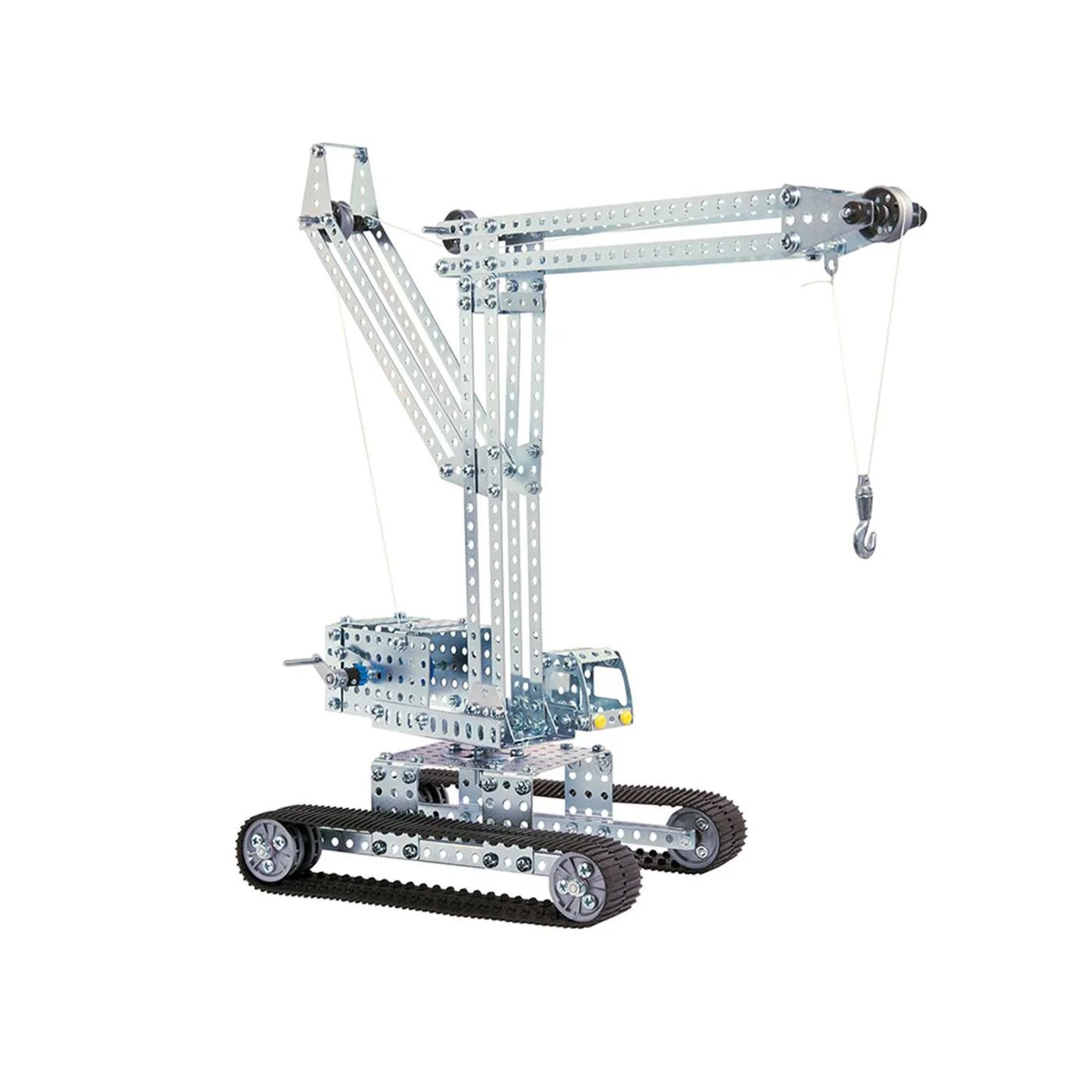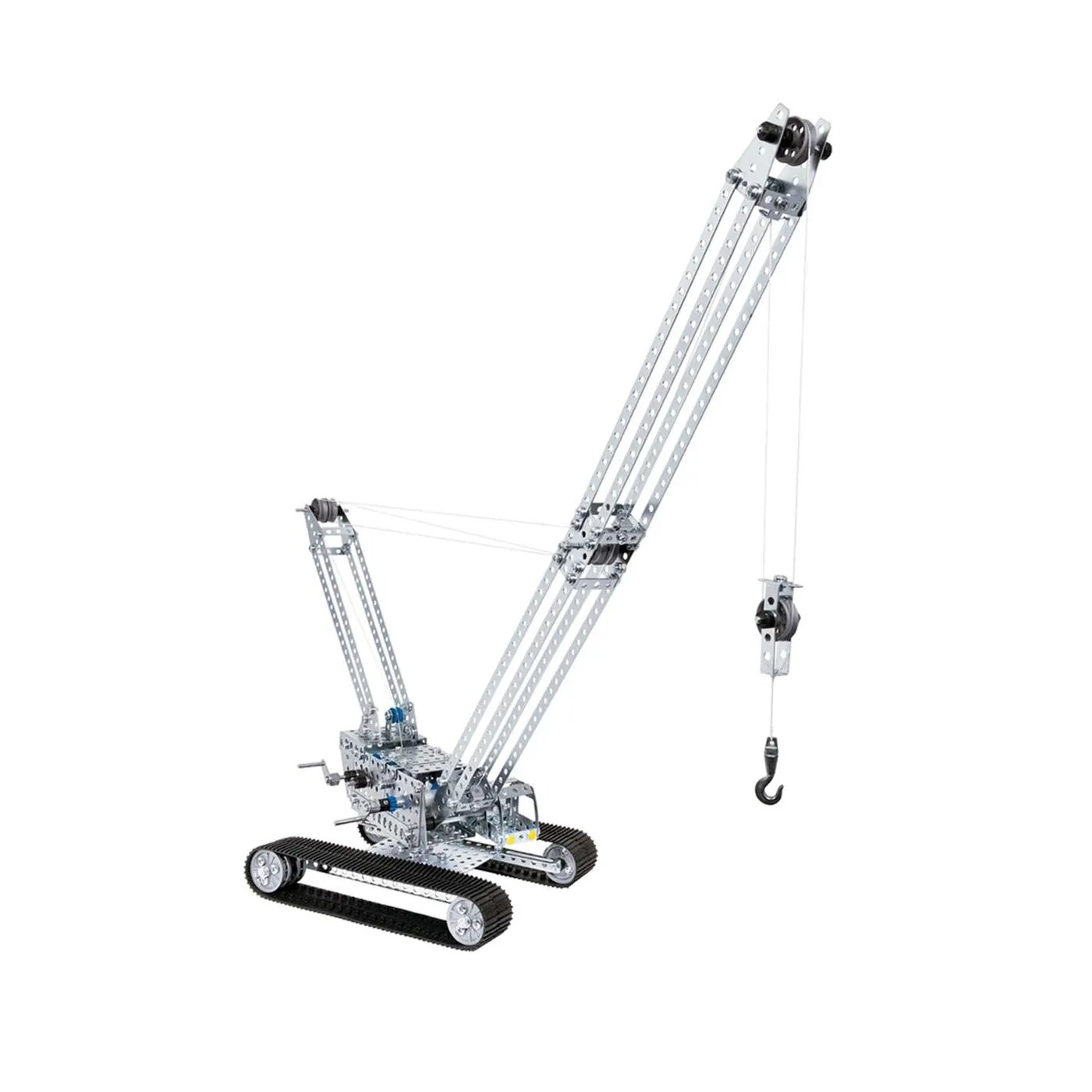 Гусеничный кран можно толкать и поворачивать вручную. Кроме того, основная модель имеет две лебедки, с помощью которых можно перемещать грузовой крюк и стрелу крана. Конструктор собирается при помощи болтов, гаек и инструмента.