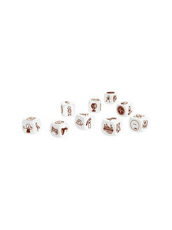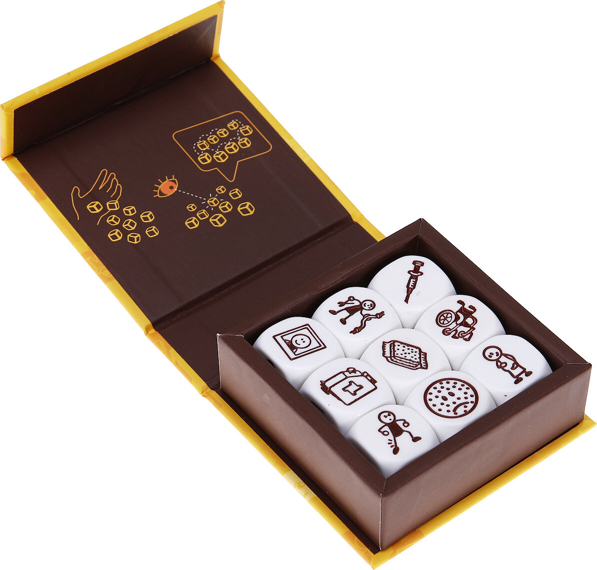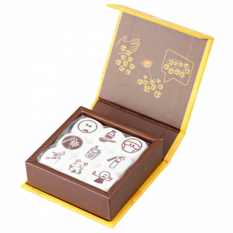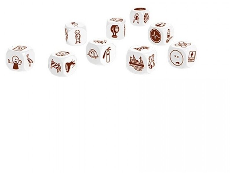 Эту версию можно объединять с любой другой, добавляя таким образом историям новые акценты. Изображения на кубиках сделаны бордовыми специально для того, чтобы различные наборы не перепутались. Как играть: Итак, в наборе девять шестигранников, на стороны которых нанесены 54 неповторяющиеся картинки с разными активностями и действиями. Вам придется их между собой связать.