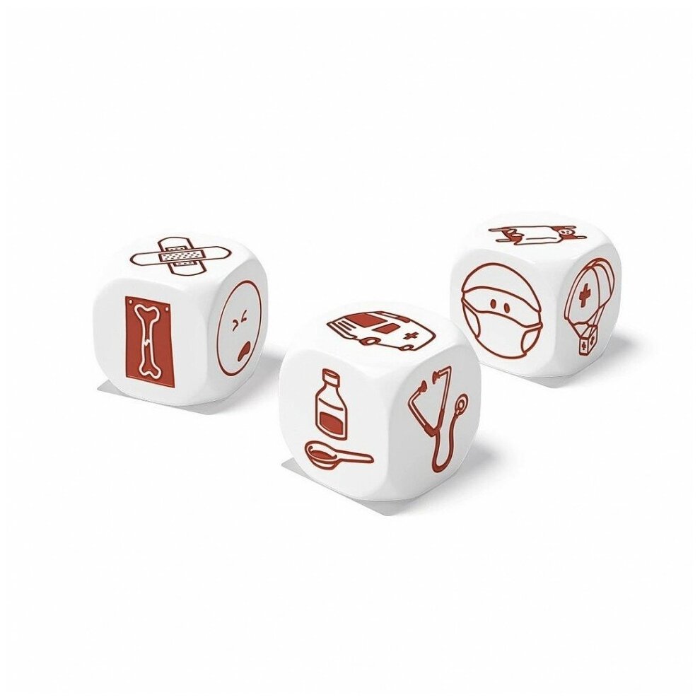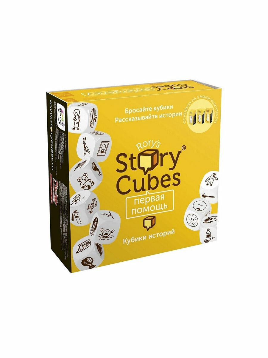 Эта версия игры посвящена оказанию первой помощи. Тема 54 изображений на этих кубиках — медицина, службы спасения, катастрофы и несчастные случаи. С одной стороны — трагические случайности, неосторожные поступки и их последствия. С другой — отважные спасатели и доктора, творящие чудеса! На чьей стороне окажется герой вашего рассказа? Картинки набора «Первая помощь» расскажут о том, в каких ситуациях людям не обойтись без помощи, кто ее оказывает и в каких случаях.