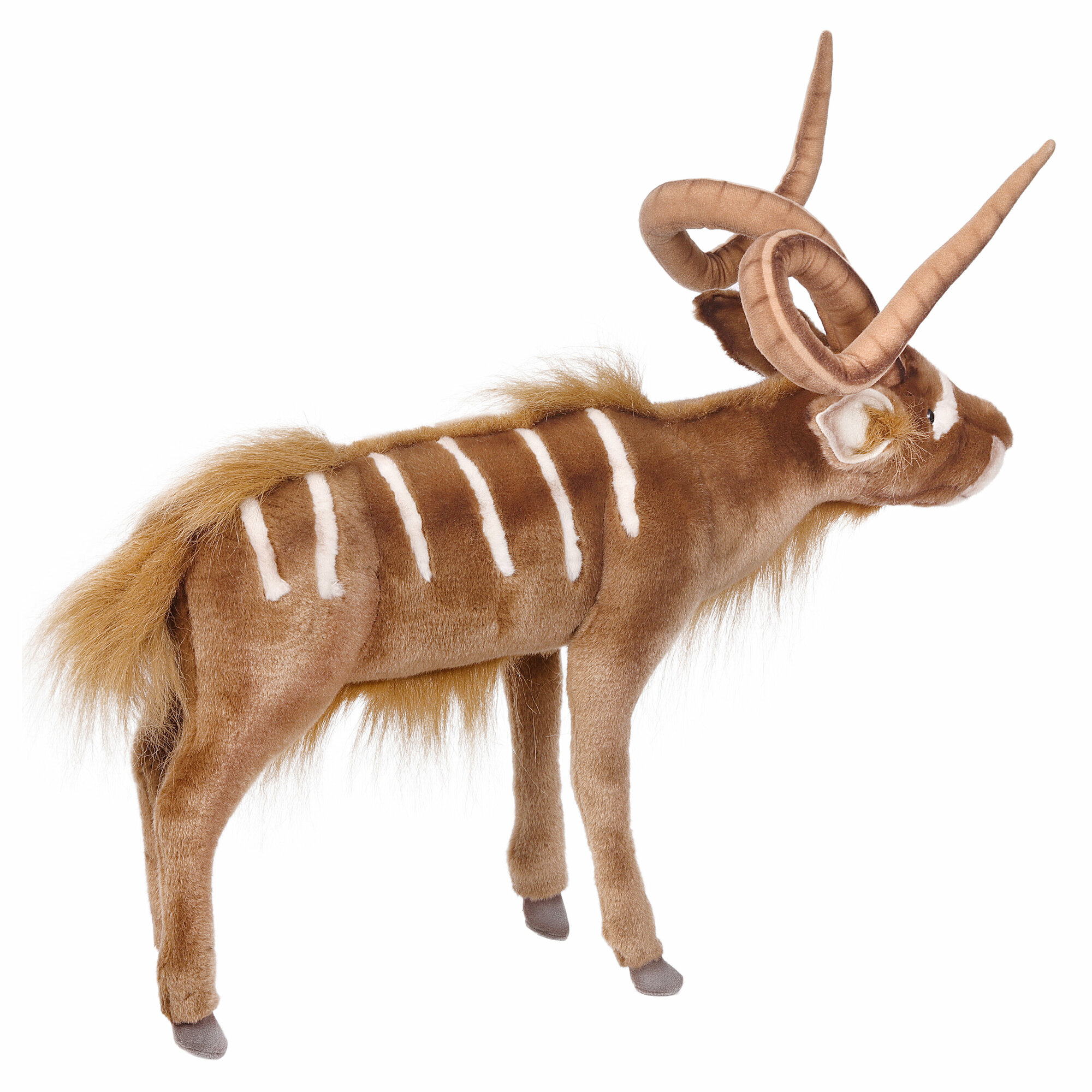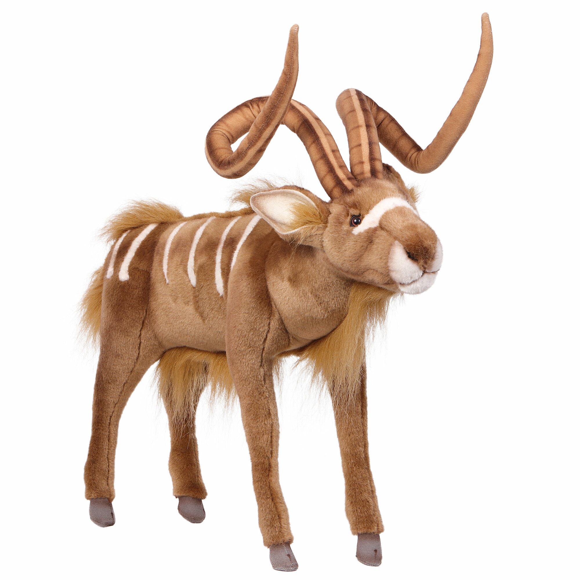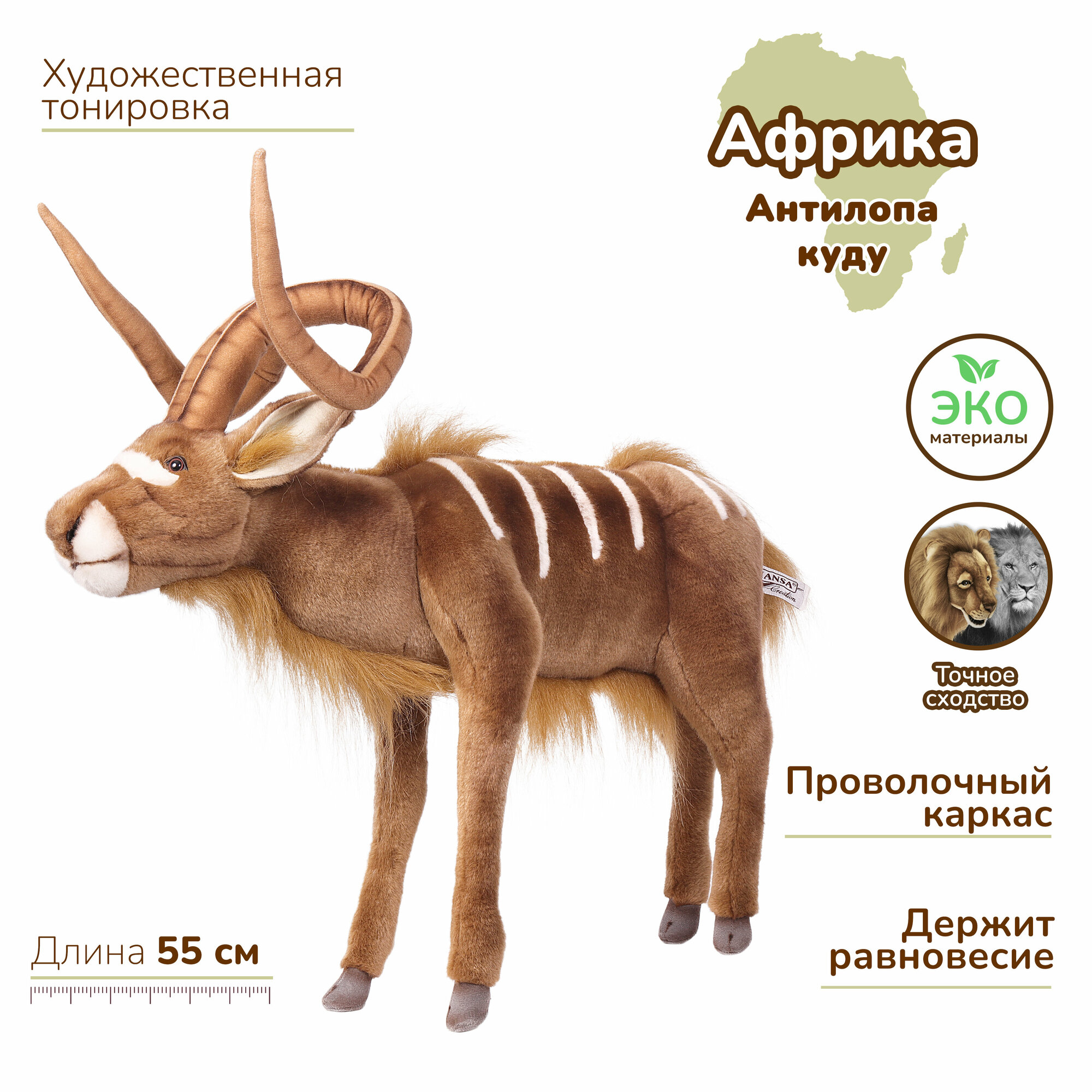 Густой шелковистый мех, абсолютно похожий на шерстяной покров животного, доверчивый взгляд лани довершают сходство игрушки с обитателем диких лесов Южной Африки. Длина Куду от задних копыт до кончика носа 50 см.