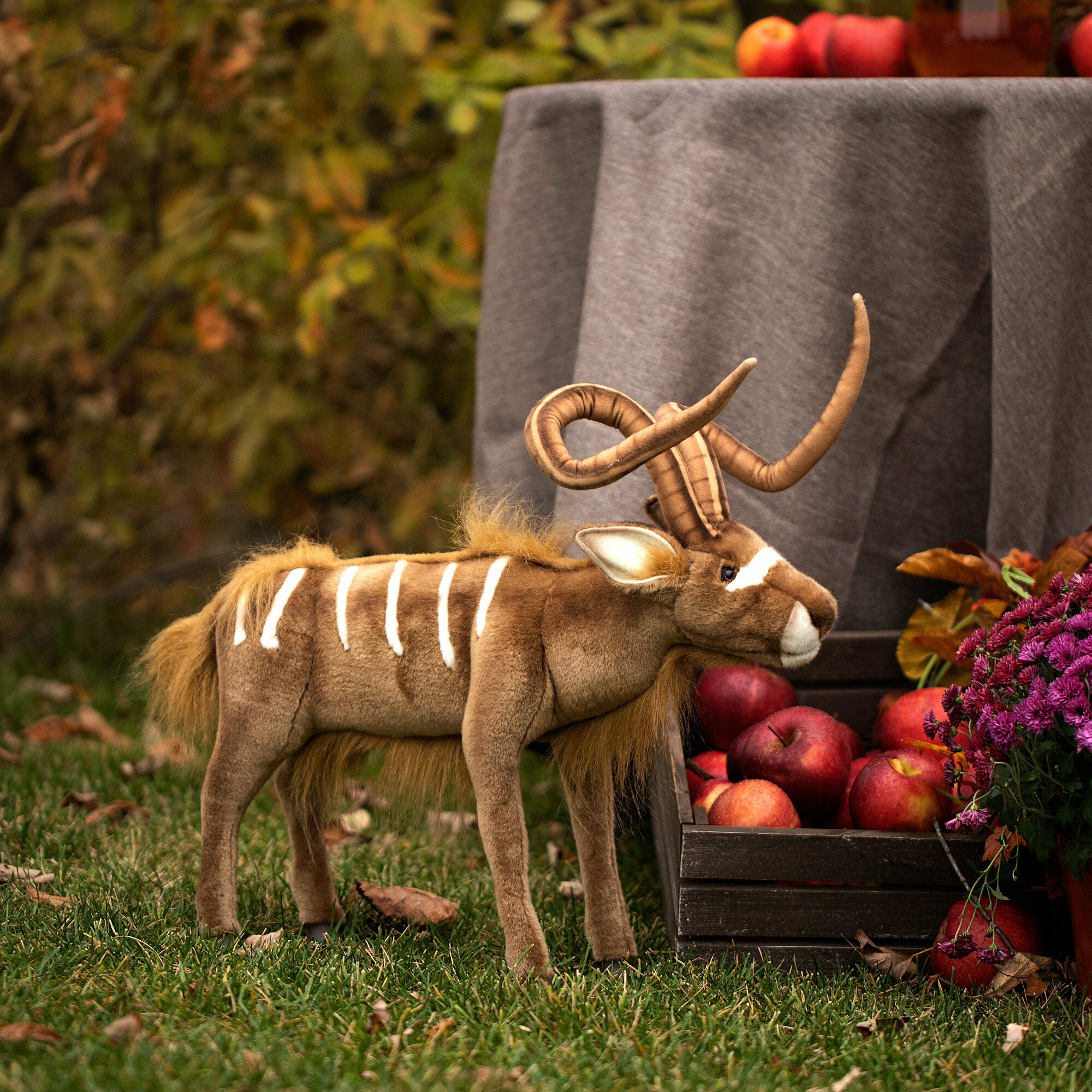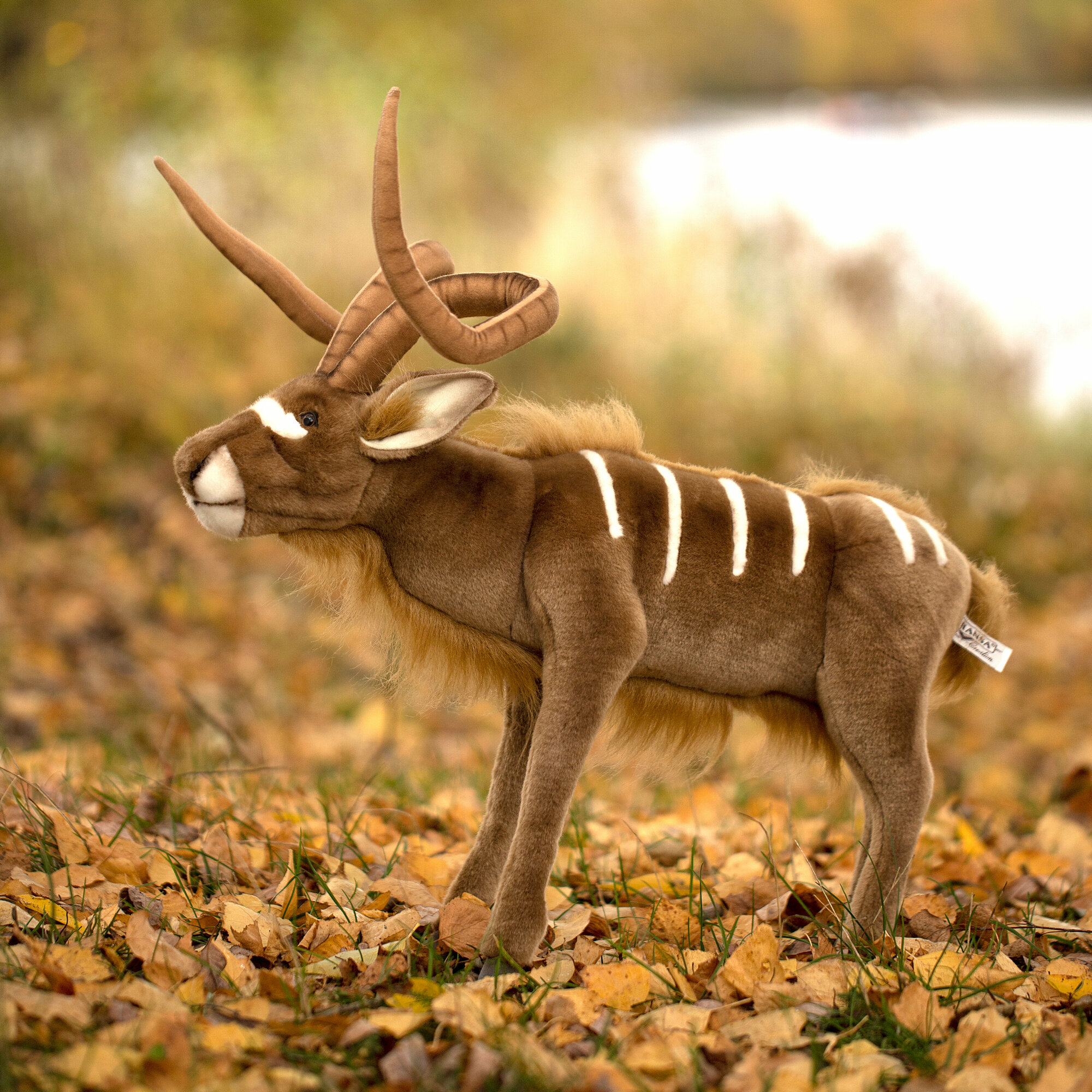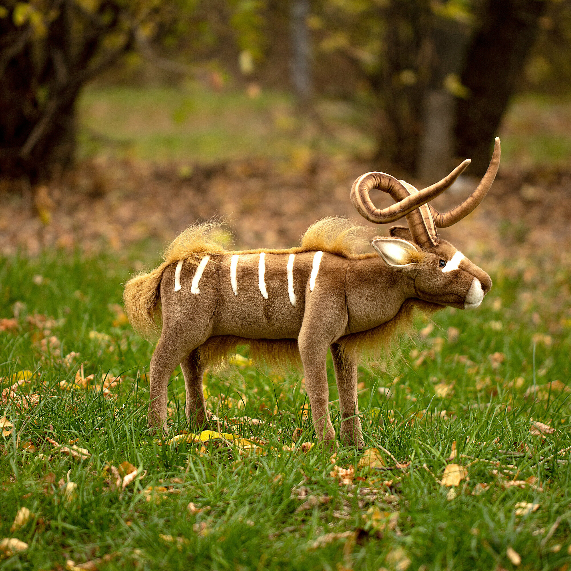 Густой шелковистый мех, абсолютно похожий на шерстяной покров животного, доверчивый взгляд лани довершают сходство игрушки с обитателем диких лесов Южной Африки. Длина Куду от задних копыт до кончика носа 50 см.