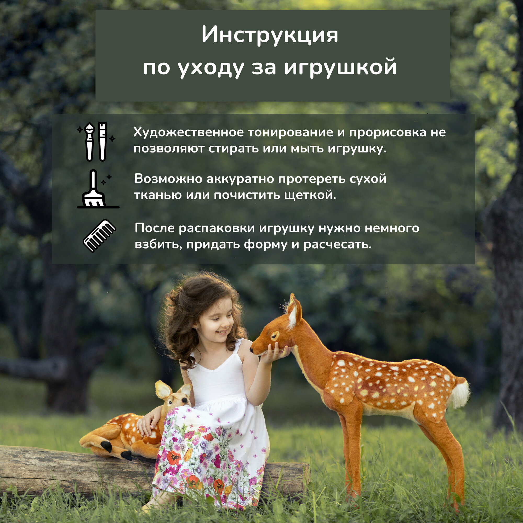 Игрушки максимально точно копируют оригинал и могут быть выполнены в натуральную величину. Шьются и набиваются вручную, что позволяет достигнуть максимальной реалистичности образа. Изготавливаются из искусственного меха, специально обработанного для придания схожести с мехом конкретного вида животного.