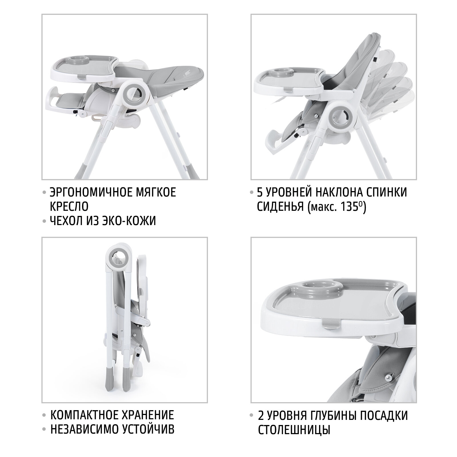 Предусмотрено 7 уровней высоты сиденья, нижний из которых позволяет малышу расположиться за детским столиком, а верхний дает возможность поместить ребенка за одним столом с взрослыми. Большая удобная столешница имеет углубление для стаканчика, бортики по краям и практичный съемный поднос. Глубину установки столешницы родители могут подобрать в зависимости от потребностей малыша, предусмотрено 2 варианта размещения — поближе и подальше от ребенка. На таком столике будет удобно не кушать, но и играть, рисовать или лепить.