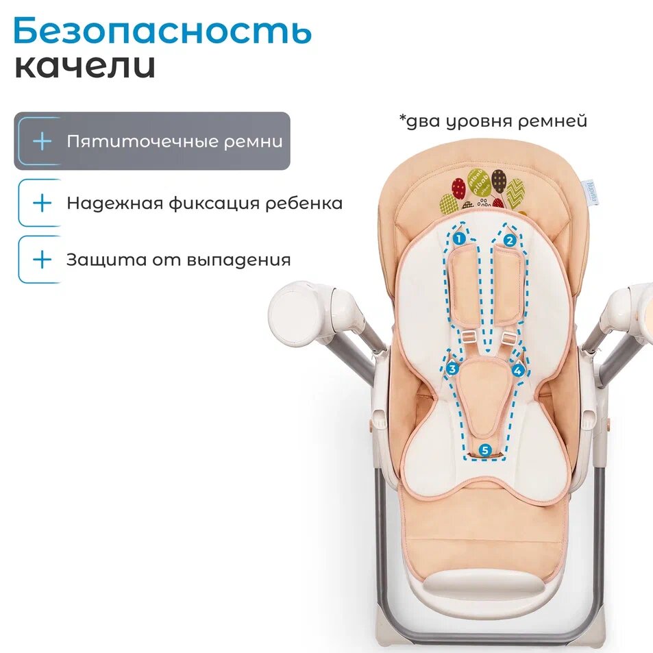 Электрокачели снабжены бесшумным маятниковым механизмом, который позволяет плавно и равномерно укачивать малыша, развлекая его и успокаивая. Они имеют две позиции регулировки спинки кресла, для того, чтобы как можно удобнее расположить ребёнка и надёжные 5- точечные ремни для безопасной фиксации малыша.