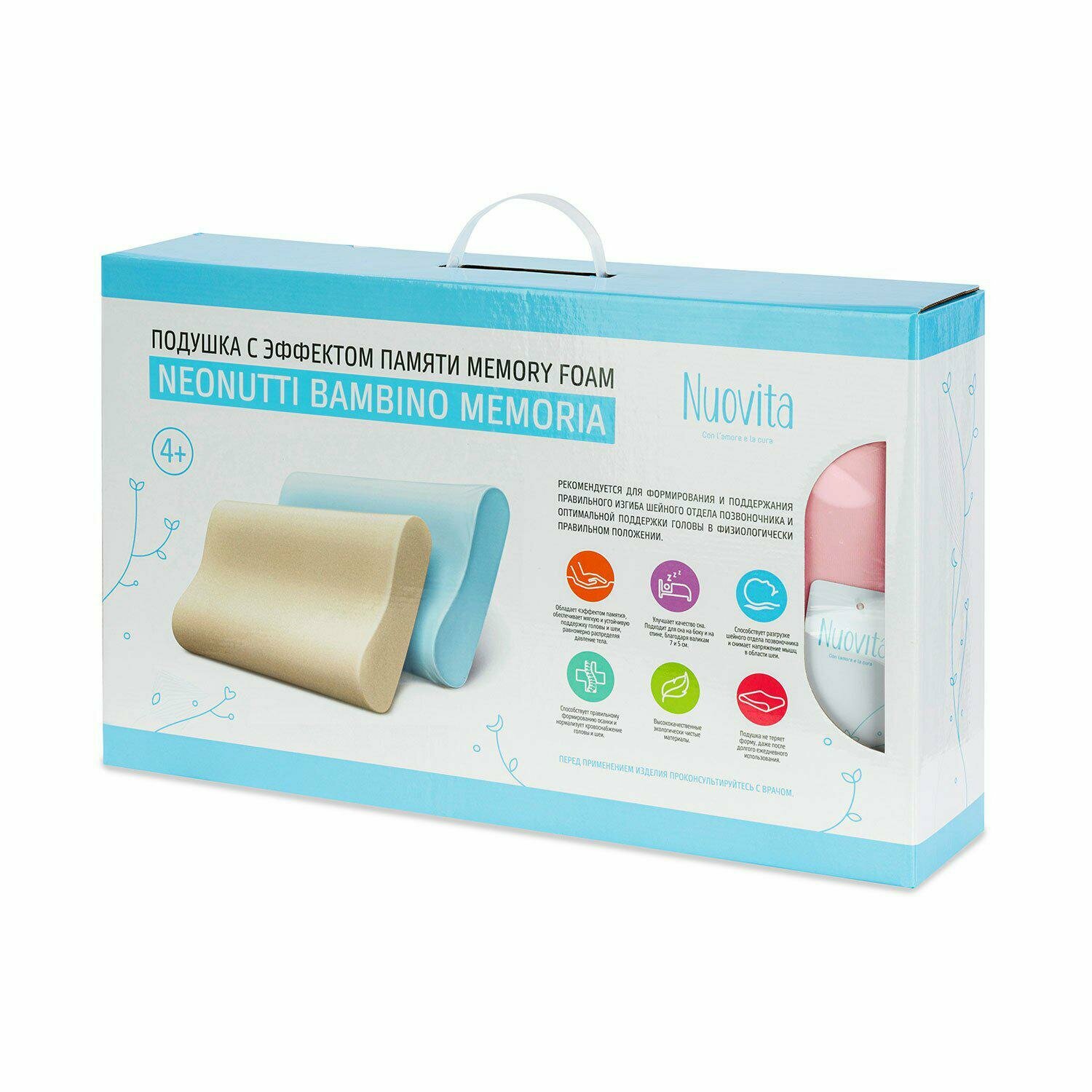 Детская подушка NEONUTTI BAMBINO MEMORIA из плотной термочувствительной пены MEMORY FOAM подходит всем малышам старше 4-х лет и предназначена для создания комфортных условий во время сна. Она обеспечивает нежную поддержку шейного отдела позвоночника, способствует правильному формированию его изгиба и эффективно снимает напряжение мышц в области шеи.