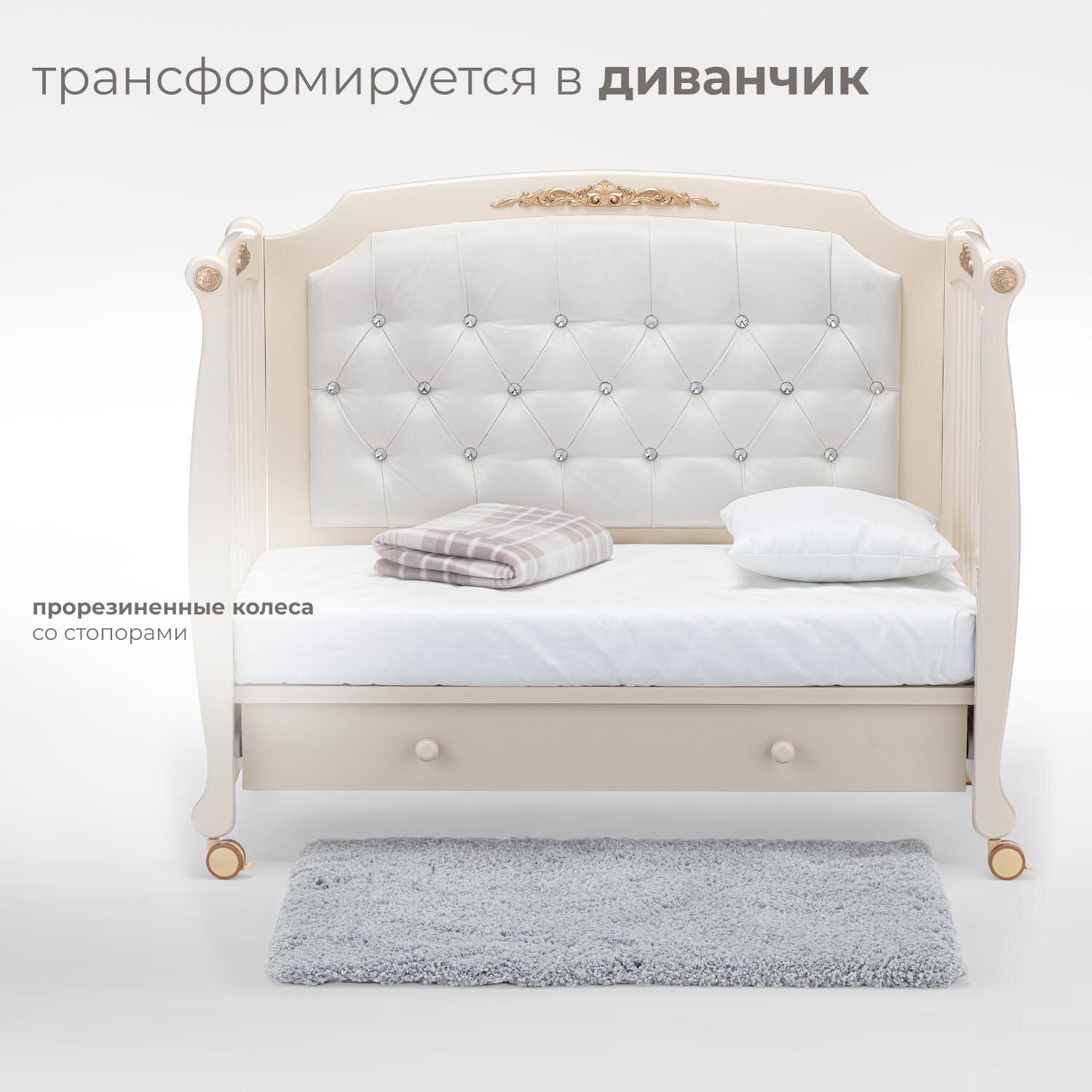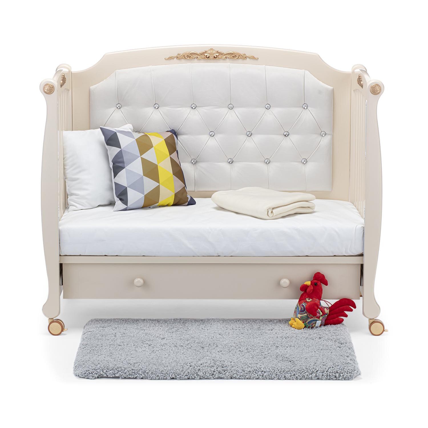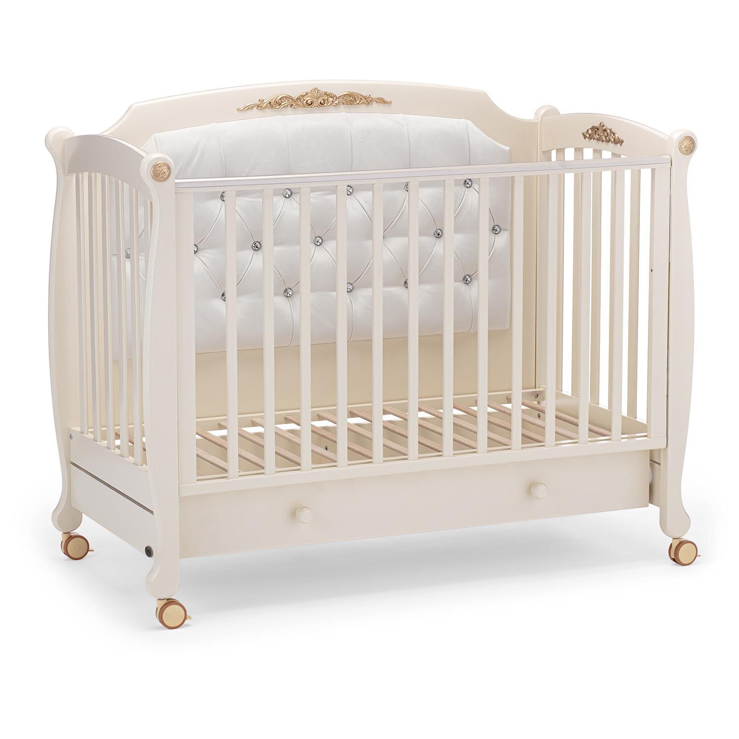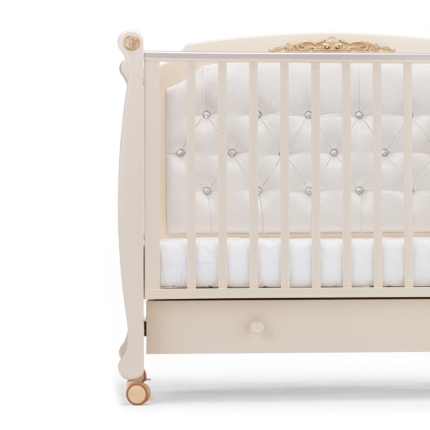 Конструктивной особенностью кроватки Нуовита Фуроре является наличие сплошной боковой стенки, которая имеет роскошную мягкую отделку и украшена накладным молдингом. Это объясняется двойным предназначением модели: в первые годы жизни малыша она будет удобным спальным местом, а затем превратится в детский диванчик с элегантной спинкой. Для трансформации достаточно убрать съемную реечную стенку.