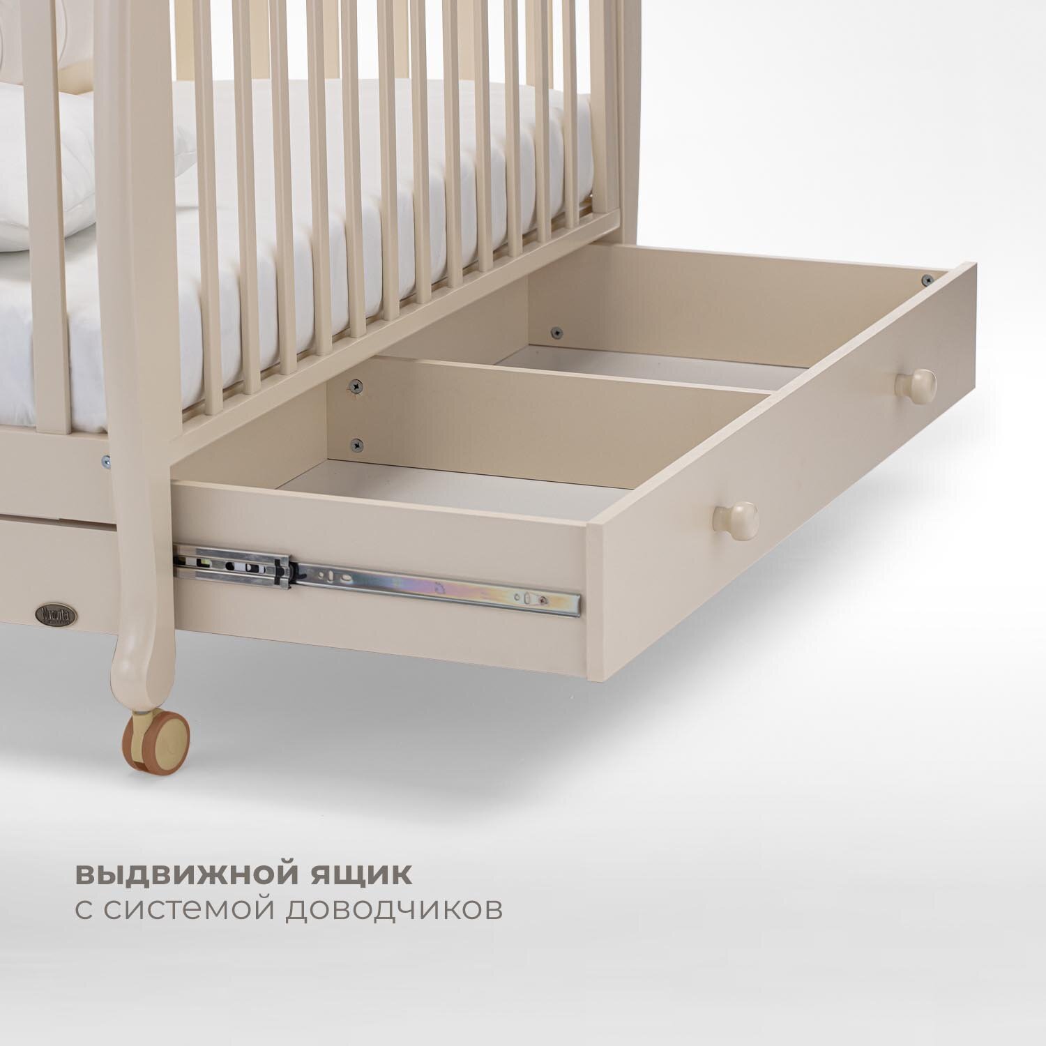 В этой модели предусмотрено традиционное — нижнее — расположение ложа (его размер составляет 120x60см). Такое решение продиктовано желанием производителя не оставлять на стойках кровати лишних отверстий. Уход за ребенком облегчается наличием регулируемой боковой стенки с надежным механизмом фиксации. Кроватка очень практична: для удобства передвижения она снабжена 4-мя прорезиненными колесиками, за фиксацию на месте отвечают стопоры, которые имеются на каждом из колес. На поручне предусмотрена силиконовая накладка. Внизу находится бельевой ящик.