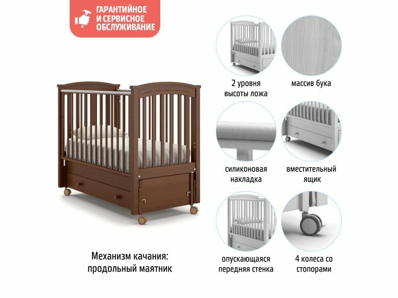 В нижней части кроватки находится ящик для хранения белья, который снабжен качественным выкатным механизмом. Кровать сделана из древесины бука, при изготовлении бельевого ящика использованы элементы из ЛДСП. Все материалы, эмалевое покрытие и фурнитура соответствуют европейским стандартам безопасности.
