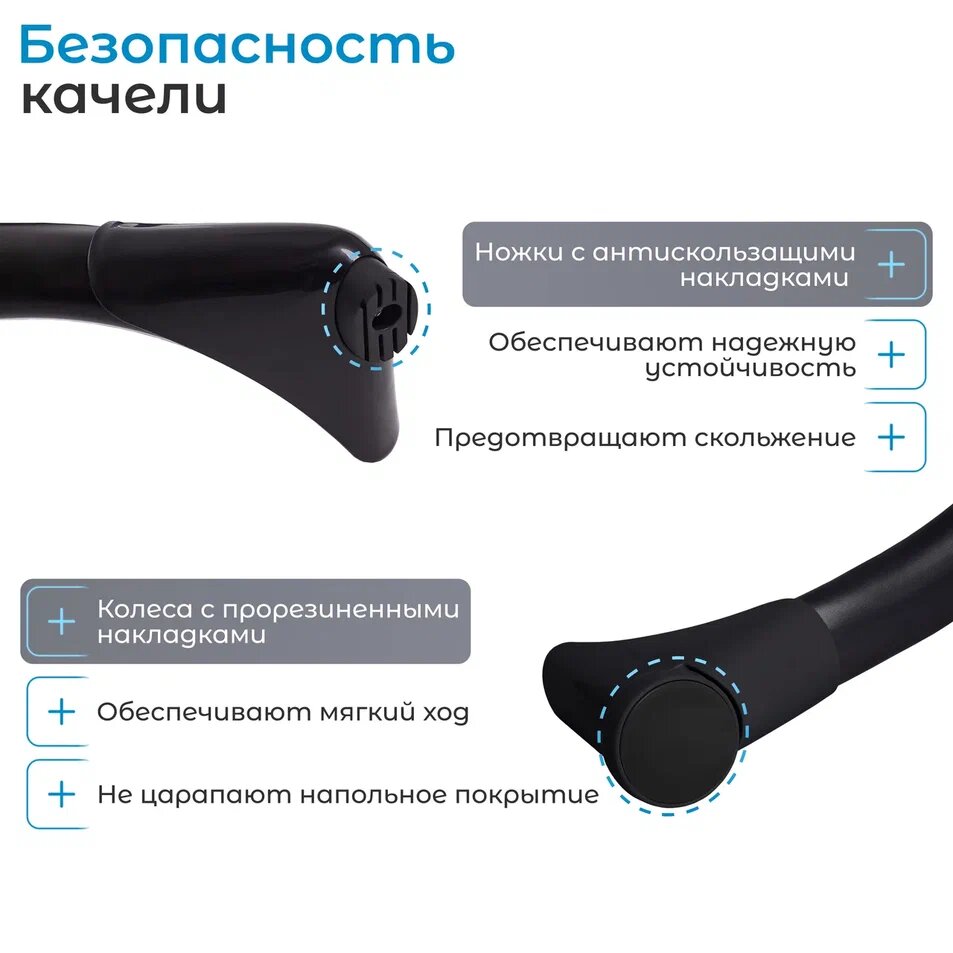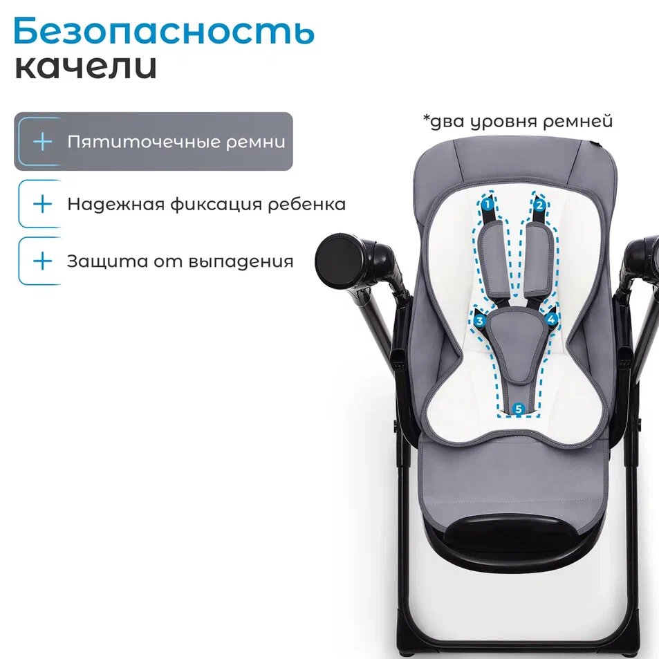 Электрокачели снабжены бесшумным маятниковым механизмом, который позволяет плавно и равномерно укачивать малыша, развлекая его и успокаивая. Они имеют две позиции регулировки спинки кресла, для того, чтобы как можно удобнее расположить ребёнка и надёжные 5- точечные ремни для безопасной фиксации малыша.