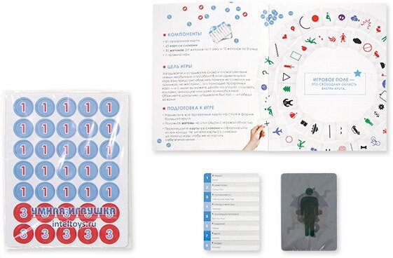 | Комплектация | 61 прозрачная карта, 65 карт со словами (8 слов на каждой), 35 жетонов победных очков, правила игры на русском языке. |