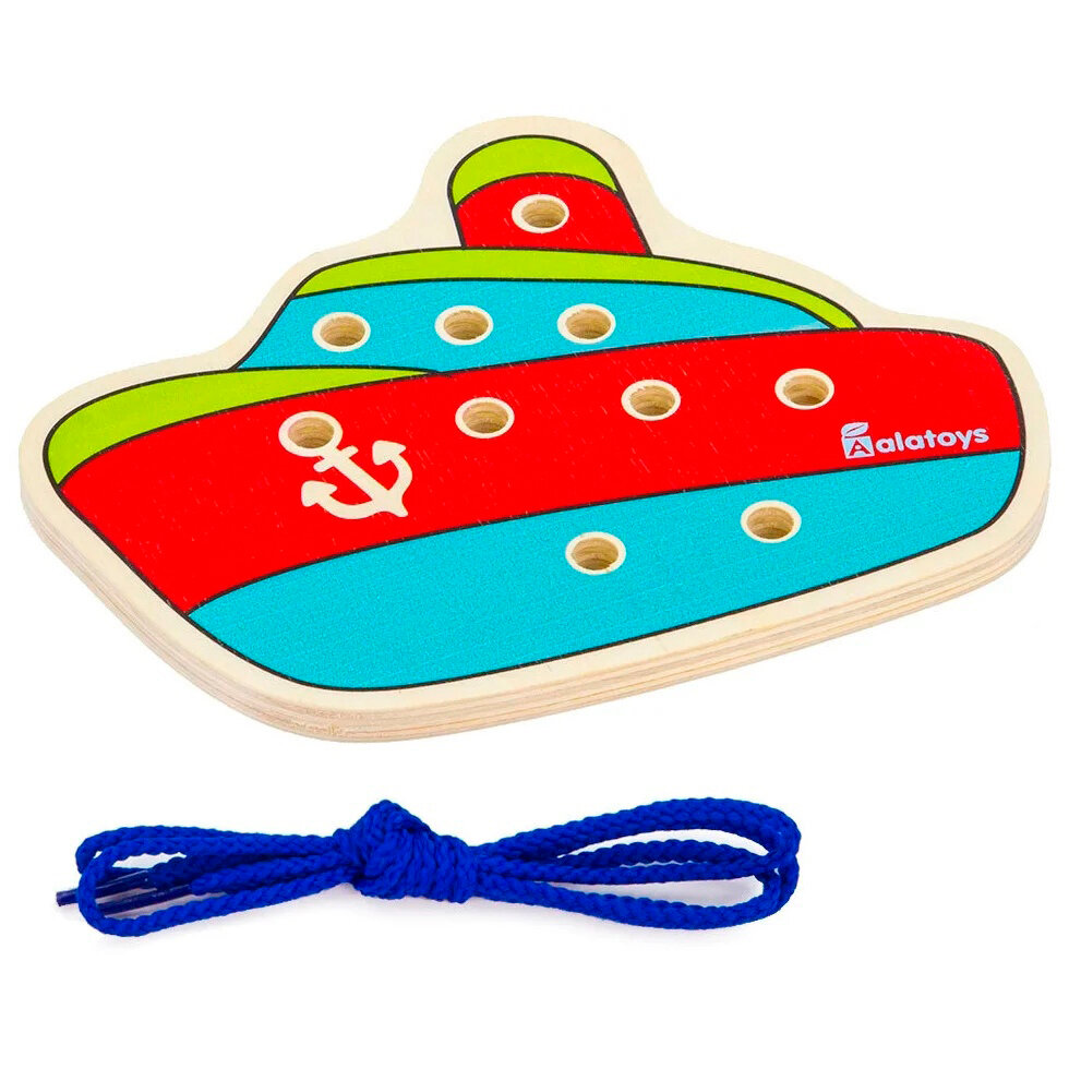 Набор для развития навыков шнурования состоит из фигурки кораблика и шнурка. На фигурке сделаны специальные отверстия.