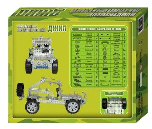 Конструктор металлический "Джип" 383 элемента - вот что понравится ребенку! Ведь все детали в нем - "взрослые" - настоящий гаечный ключ, отвертка и 26 видов деталей.