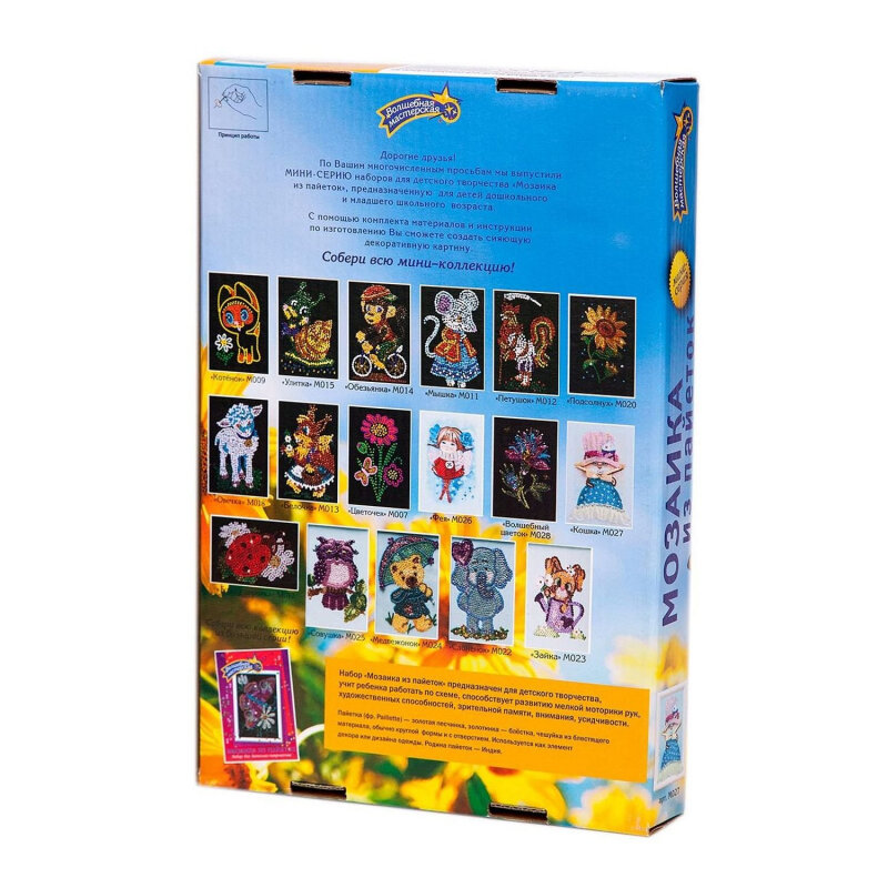 Мозаика из пайеток — новое, позитивное занятие для проведения семейного досуга. Ваш ребенок самостоятельно или вместе с вами соберет прекрасную картину, которая станет великолепным подарком близким и друзьям или стильным интерьерным украшением.