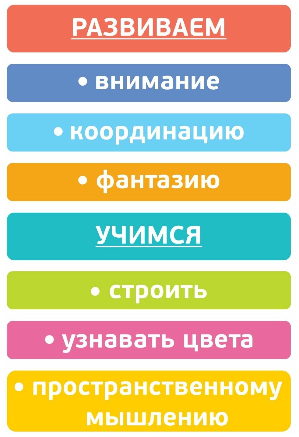 - В процессе игры ребенок сможет развить мелкую моторику рук, логическое мышление, пофантазировать, а также выучить основные цвета, разобраться с понятиями формы и размера.