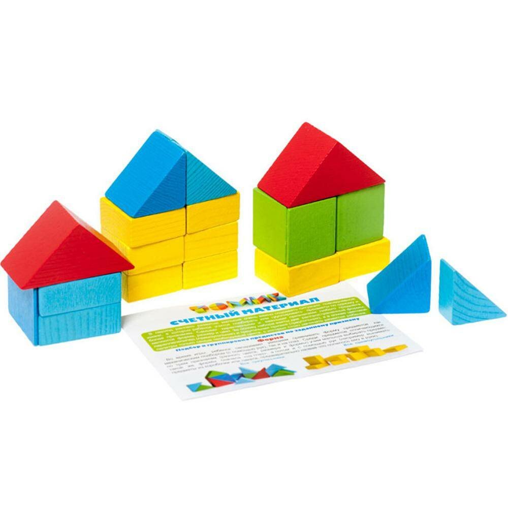 - В комплекте 26 деталей, выполненных в виде различных геометрических фигур, отличающихся по цвету и форме.