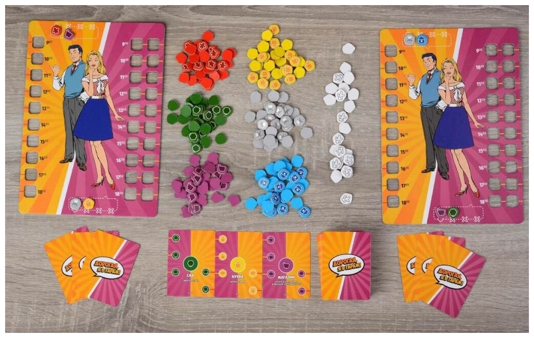 Как? Играем карты дел, отмечаем фишками занятые часы. Собираем сеты карт, подкладываем сложные карты дел другим игрокам. Заполняем свой планшет раньше всех.