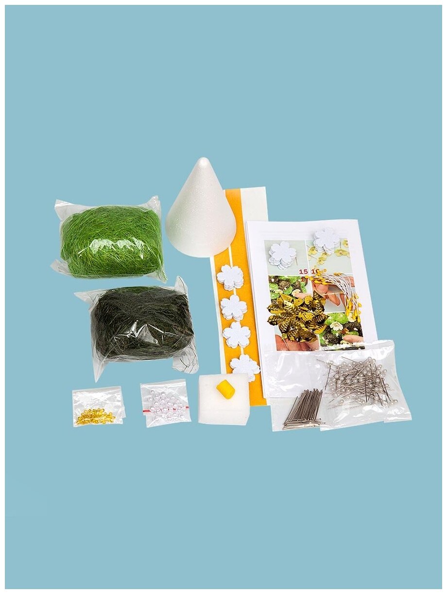 | Состав набора | Конус пенопластовый 12 см, Готовая вырубка из FOM EVA, Фигурные пайетки - листочки, Зубочистки, Гвоздики-булавки, Бусины, бисер, Сизаль, Декоративные ягоды, завитки, Инструкция с пошаговым описанием и фото |