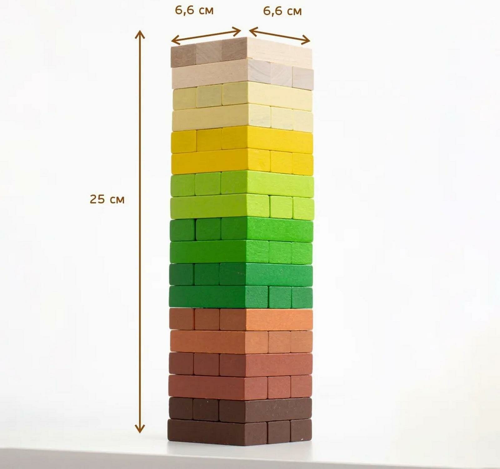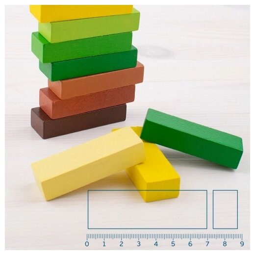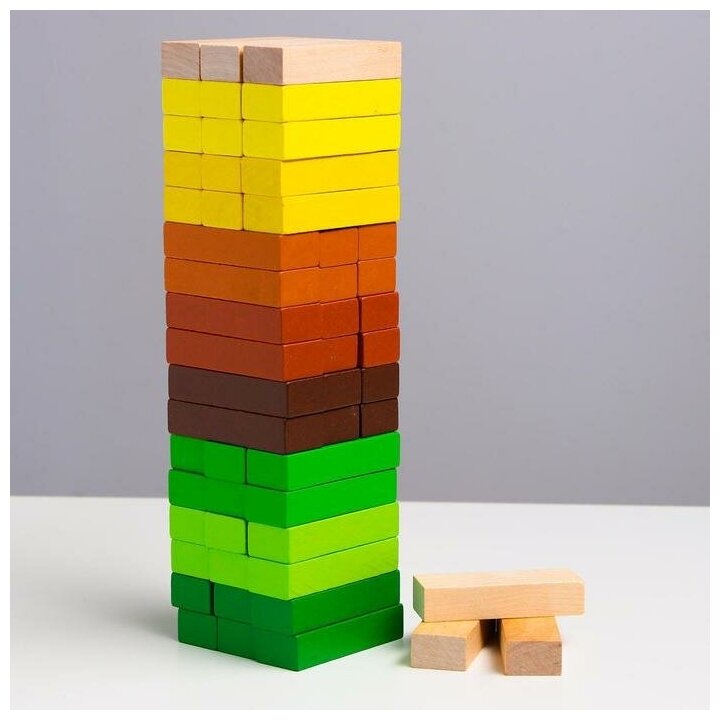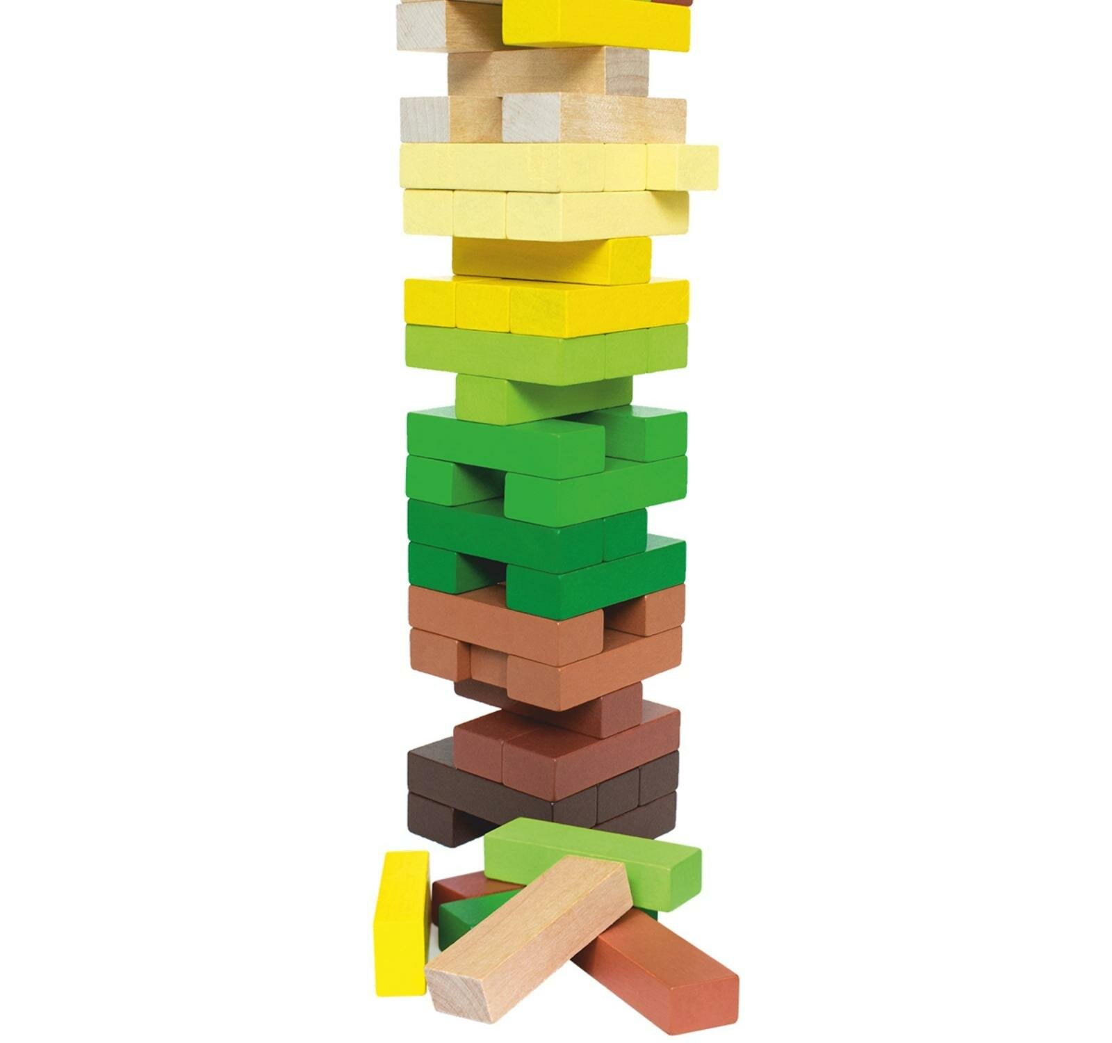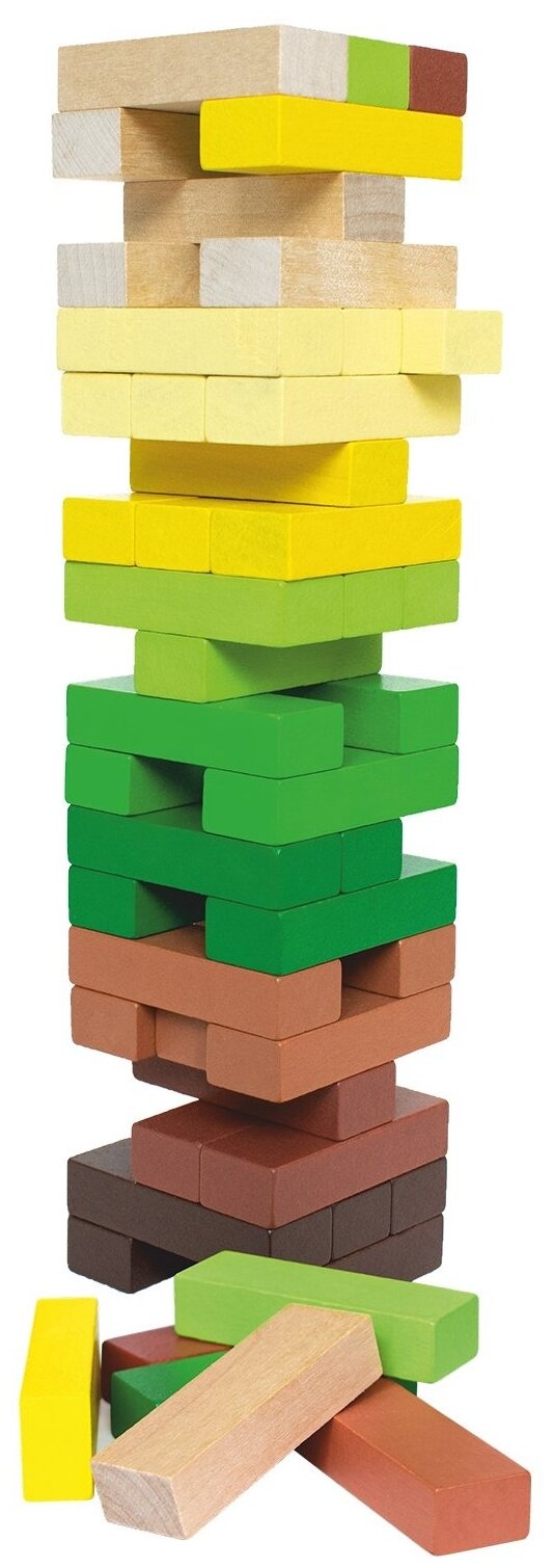 В начале игры сложите башню из 18 уровней по три бруска в каждом, так, чтобы бруски соседних уровней лежали в разных направлениях. После того как башня готова, по очереди вытаскивайте из нее по одному брусочку и перемещайте его на самый верхний уровень, тем самым, продолжая строительство башни и постепенно уменьшая ее устойчивость.