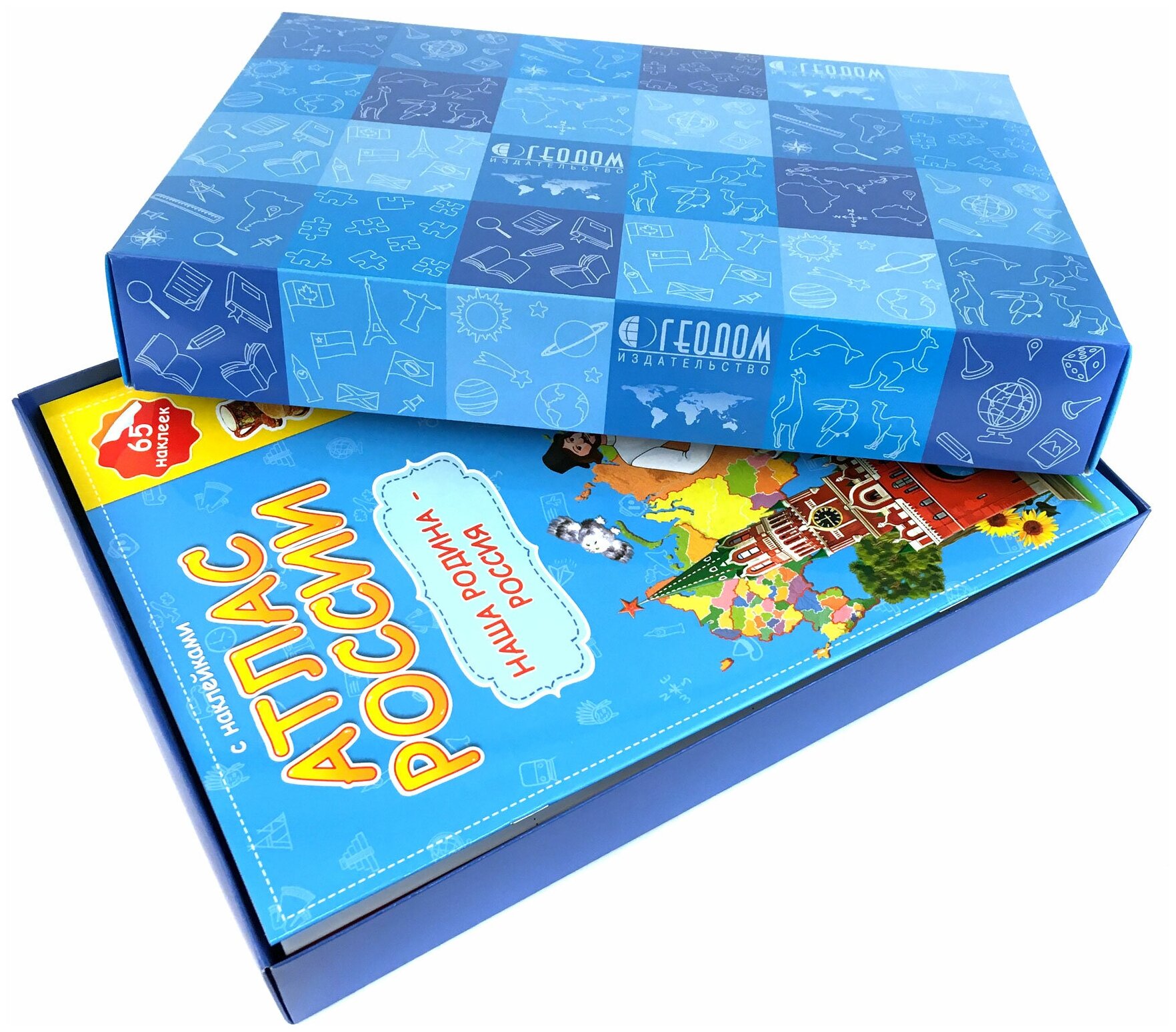 В атласе дан гимн России, описание герба, флага государства, карта с делением по федеральным округам. Из атласа дети узнают о народах, населяющих страну, и их национальных костюмах, о государственных религиях, основных достопримечательностях.