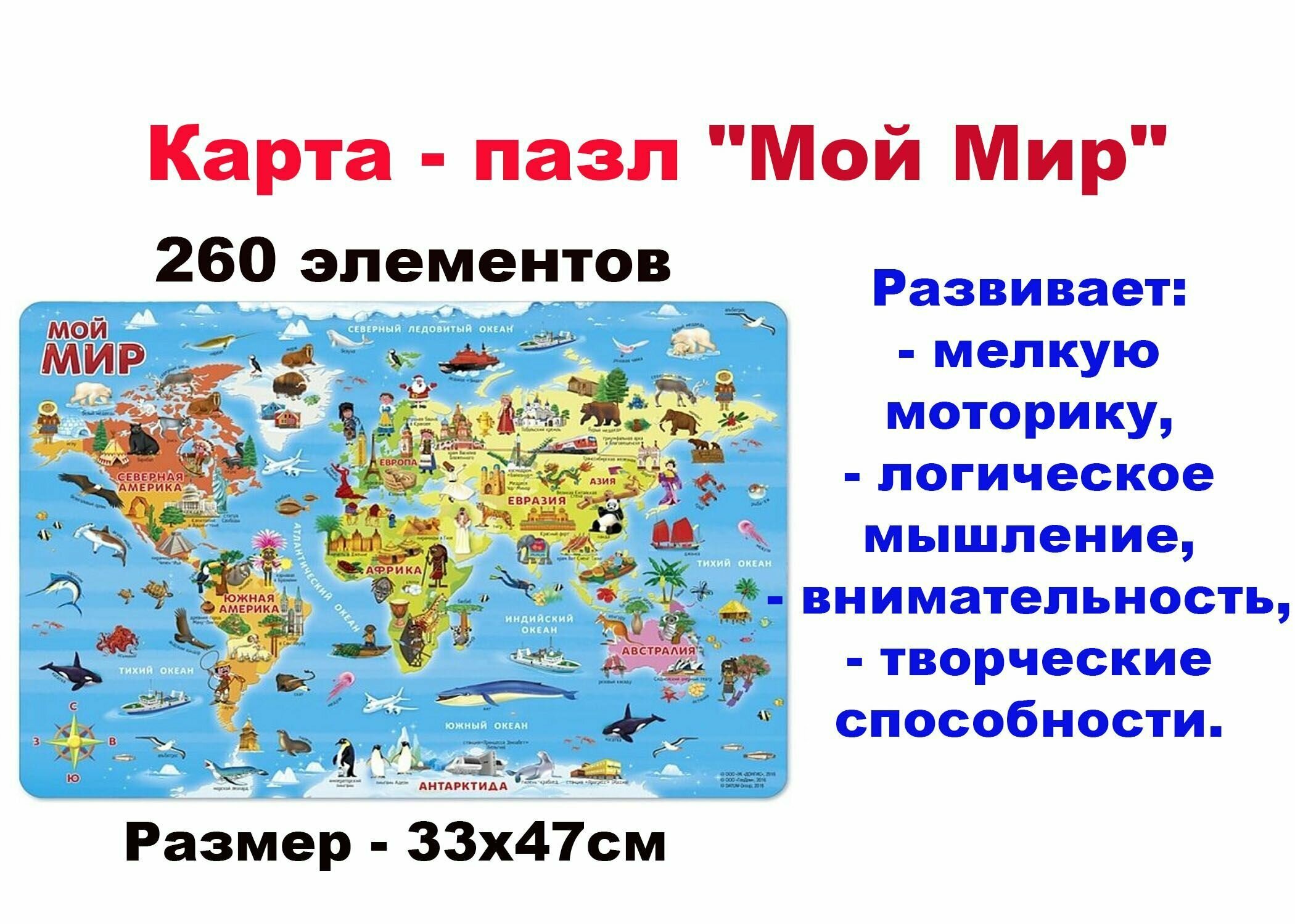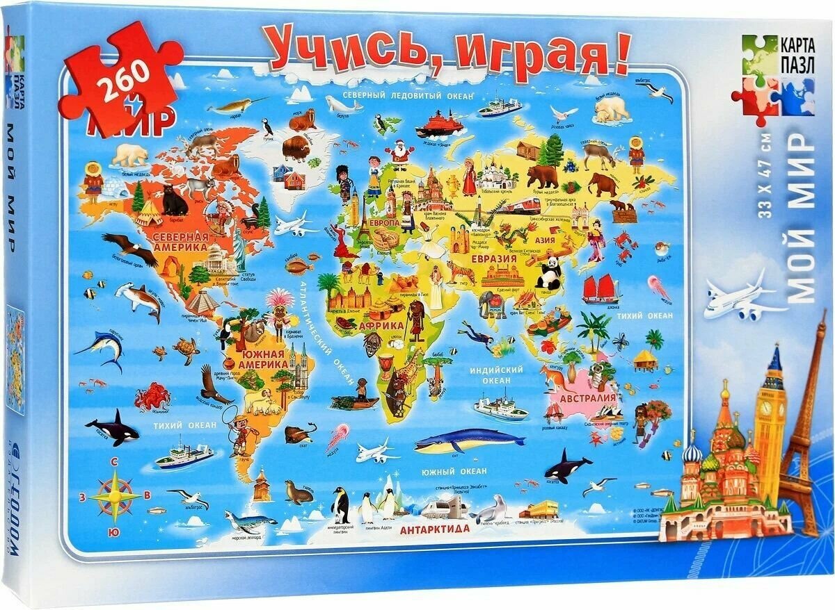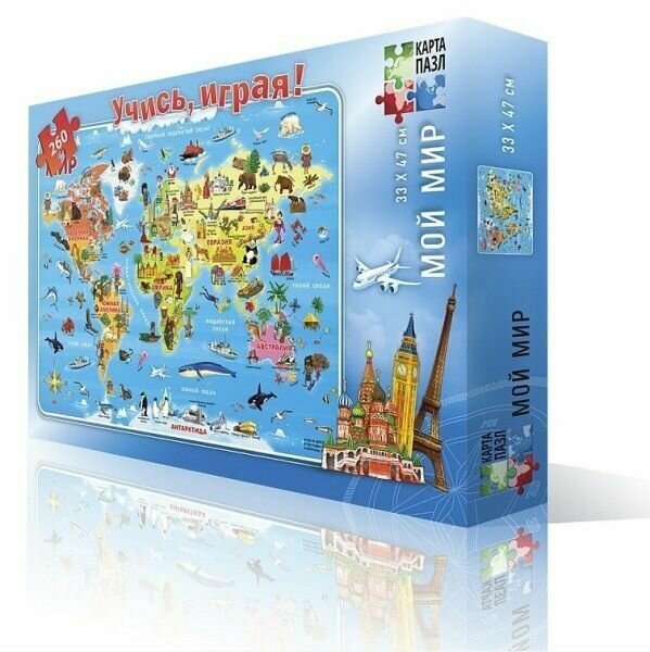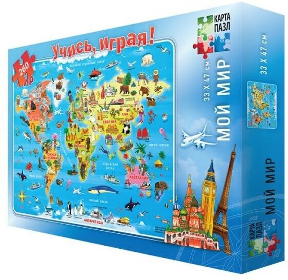 Пазл «Мой мир» поможет весело и познавательно изучить с ребенком окружающий мир. Собирая яркие и красочные детали головоломки, ребенок сможет запомнить как выглядят континенты и узнать какие интересные особенности и достопримечательности на них находятся.