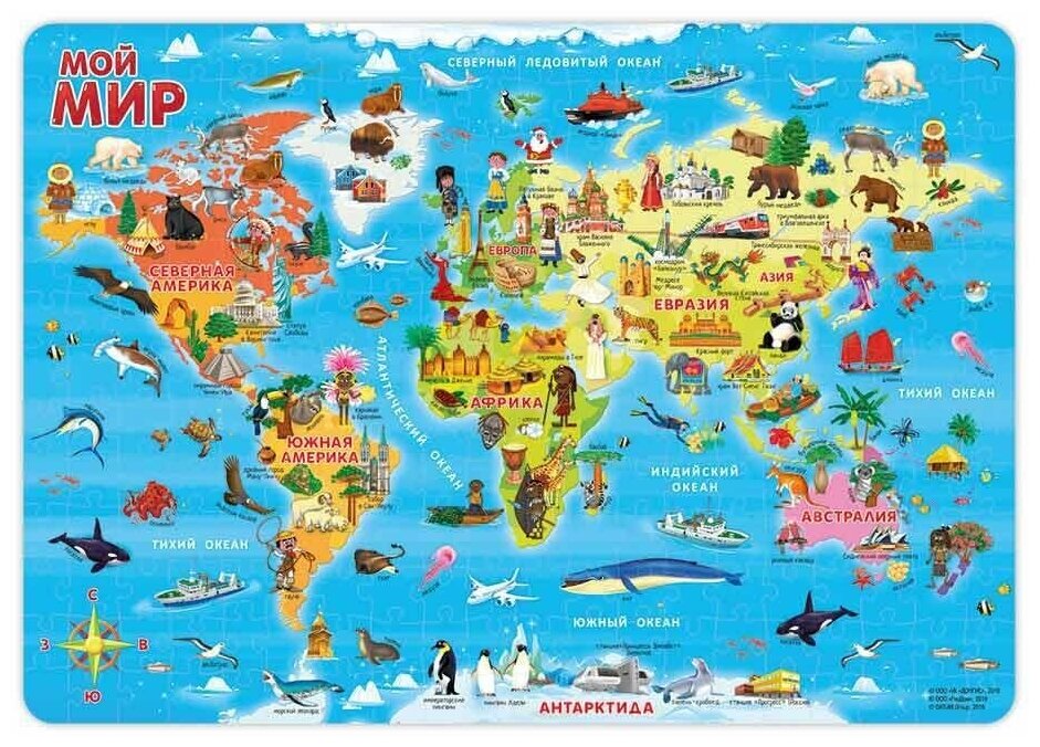 Карта-пазл "Мой мир" от "Геодом" станет интересным предложением для детей, которые тянутся к знаниям. Из двухсот шестидесяти элементов ребенку предстоит собрать карту мира. На ней есть интересные отметки об обитателях континентов и океанов.