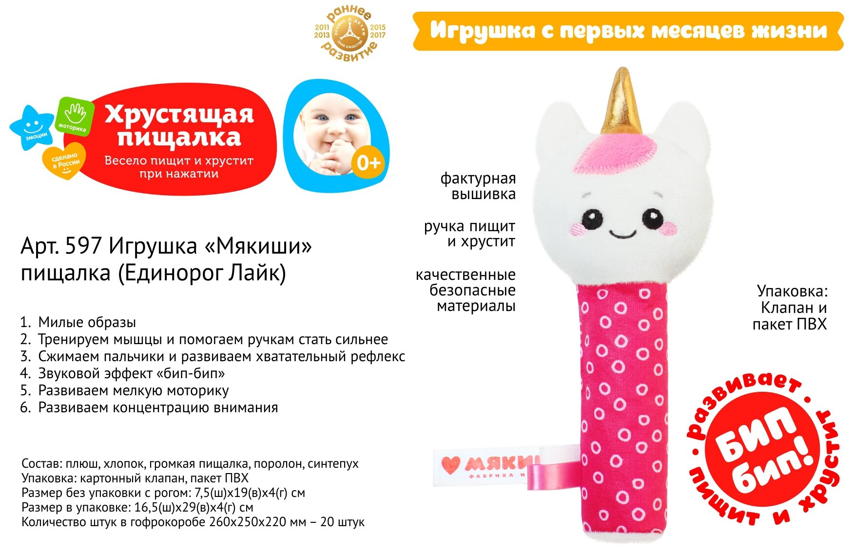 С первых месяцев жизни малыша погремушка-пищалка от «Мякишей» станет прекрасной развивающей игрушкой вашего ребенка.