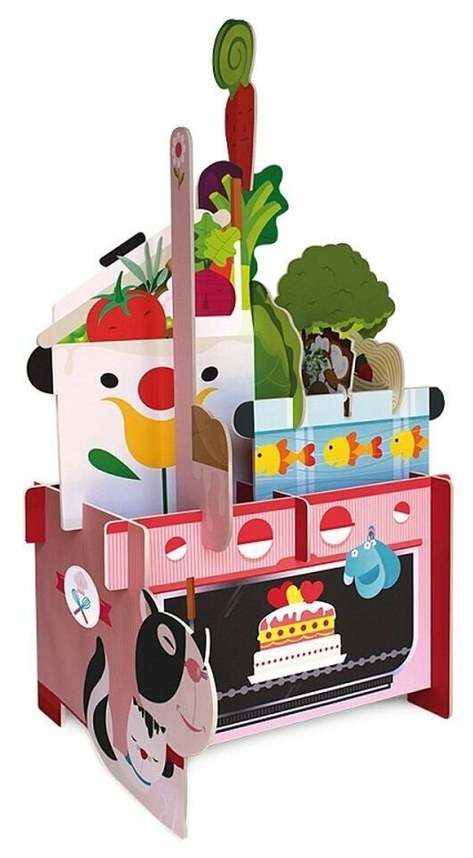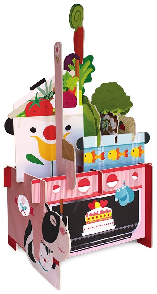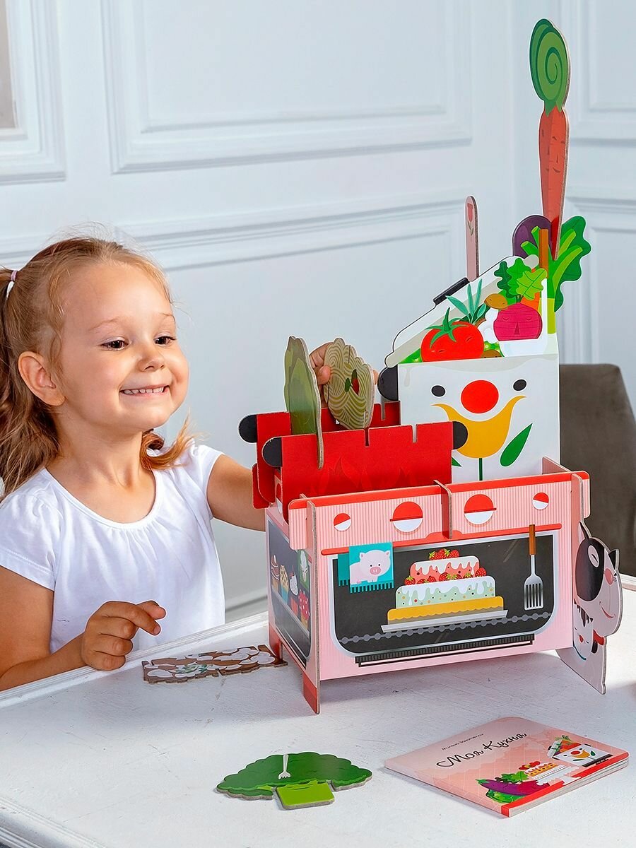 В чемоданчике вы найдете иллюстрированную книжку-историю и 14 крупных деталей пазла. Соберите огромный 3D пазл из прочного и экологически безопасного картона, прочитайте историю в стихах и узнайте, что хранится в кладовке.