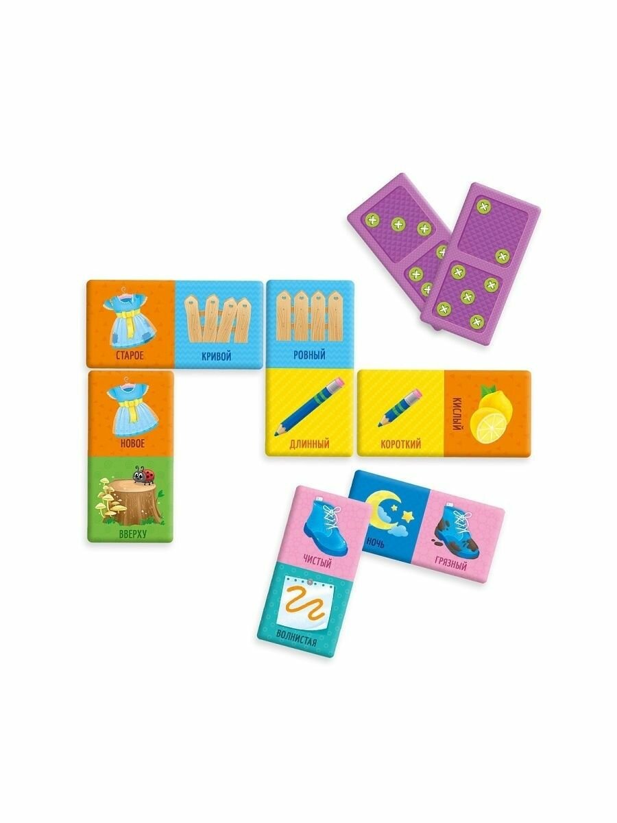 Детское домино «Найди противоположности» расширяет кругозор и знакомит ребенка с окружающим миром, развивает его память, внимание, быстроту реакции, пространственное и логическое мышление. Также во время игры малыш учится сравнивать и сопоставлять предметы.
