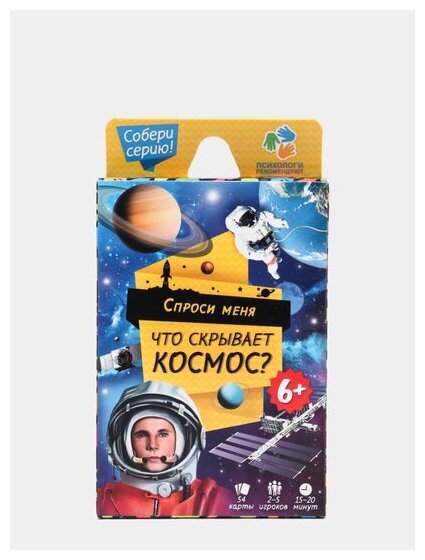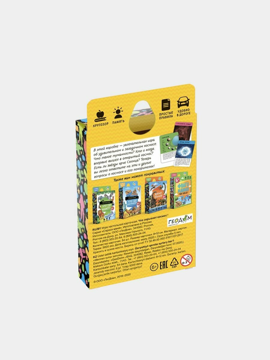 В этой коробке увлекательная игра об удивительном и загадочном космосе. Что такое туманности? Кто и когда впервые вышел в открытый космос? Есть ли звезды ярче солнца? Теперь вы легко ответите на эти и другие вопросы о космосе и его покорителях.