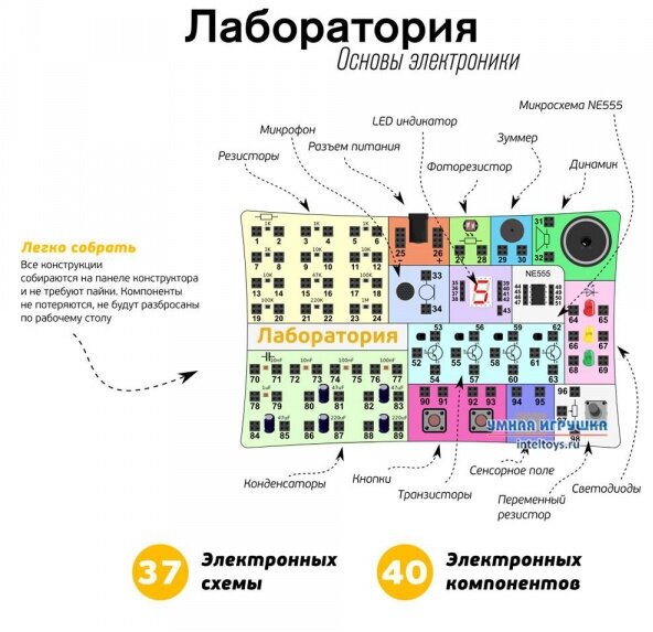 Никакой пайки и безопасно! Набор «Лаборатория. Основы электроники» не требует пайки. Все конструкции собираются путем соединения разъемов проводами без пайки.