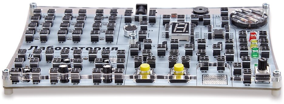 Макетная плата. Основа всех конструкций. На плате установлены все электронные компоненты. К выводам электронных компонентов подключены разъемы. Разъемы соединяются между собой с помощью проводов из комплекта набора. Каждый разъем пронумерован. Провода можно вставлять и вынимать сколько угодно раз.