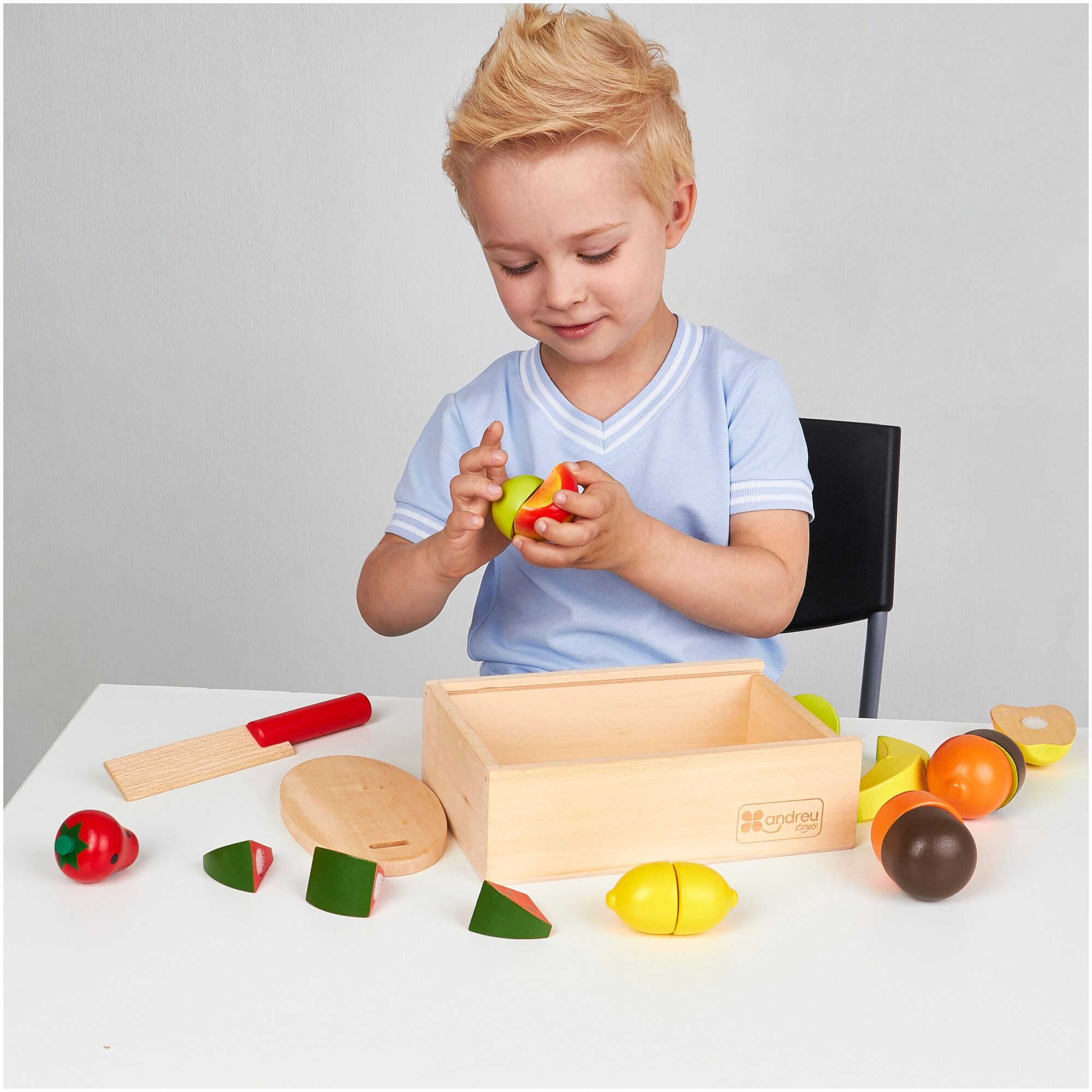 В наборе порезанных продуктов ANDREU Toys есть все необходимое для начинающего повара: и продукты, и разделочная доска с ножом. Поэтому малышу достаточно лишь немного потрудиться и разделить аппетитные фрукты на части, а потом можно красиво разложить их на тарелочке и ждать гостей.