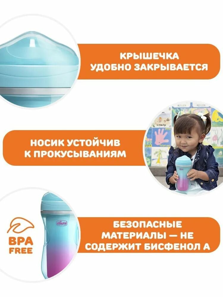 Чашка-поильник ActiveCup (носик ободок), 266 мл. бренда Chicco предназначена для детей от 14 месяцев. Поильники незаменимы во время прогулки. Для удобства использования поильник имеет эргономичную форму чашки с внутренней колбой, позволяющей сохранять температуру жидкости. Форма носика (ободок) напоминает край взрослой чашки и, во время питья, способствует правильному расположению губ и языка ребёнка. Носик-ободок выполнен из пластика, устойчив к укусам острыми детскими зубками. Запатентованная конструкция силиконового клапана препятствует проливанию жидкости. По мере взросления ребенка, развития навыка самостоятельного питья, поильник можно использовать и без клапана, в этом случае будет создаваться сильный поток жидкости. Защелкивающаяся пластиковая крышечка носика поильника защитит от пыли и загрязнений.