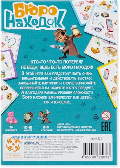 Кто-то что-то потерял? Не беда, ведь есть Бюро находок! В этой игре вам предстоит быть очень внимательным и действовать быстро: запоминайте картинки и скорее вычисляйте появившийся на обороте карты предмет. А благодаря разным уровням сложности Бюро находок заинтересует как детей, так и взрослых.
