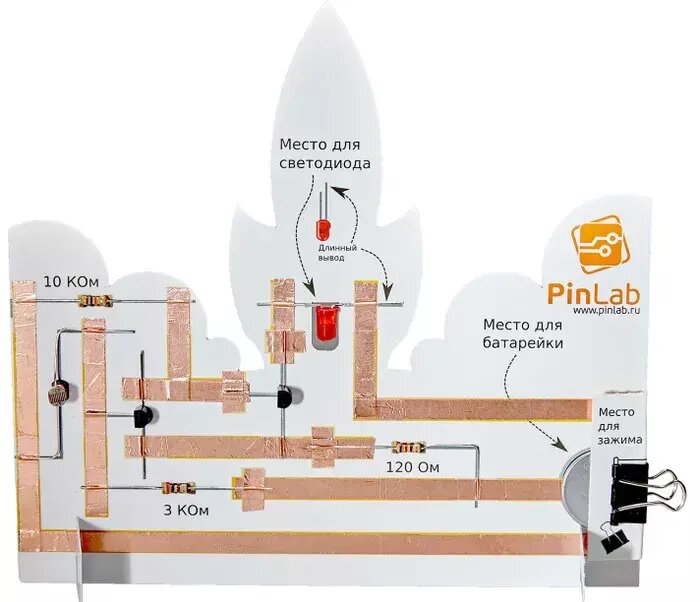 Космический ночник — устройство с датчиком освещенности, выполненное в виде взлетающей ракеты. Как стемнеет, из сопла ракеты покажется красное пламя (загорится светодиод). Что это дает? Изучается фоторезистор, транзистор, светодиод. Рассматривается работа триггера Шмитта.