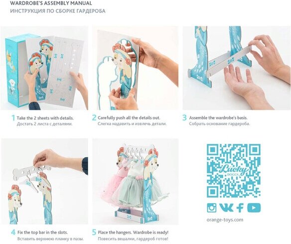 - У каждой игрушки из коллекции Lucky Doggy шея на шарнире и есть магнитики в лапках, благодаря которым они могут принимать разные позы. Все они упакованы в подарочную бирюзовую коробочку, которая превращается в гардероб с вешалками. И поскольку вся одежда легко снимается и их можно переодевать такой шкафчик будет как раз кстати.