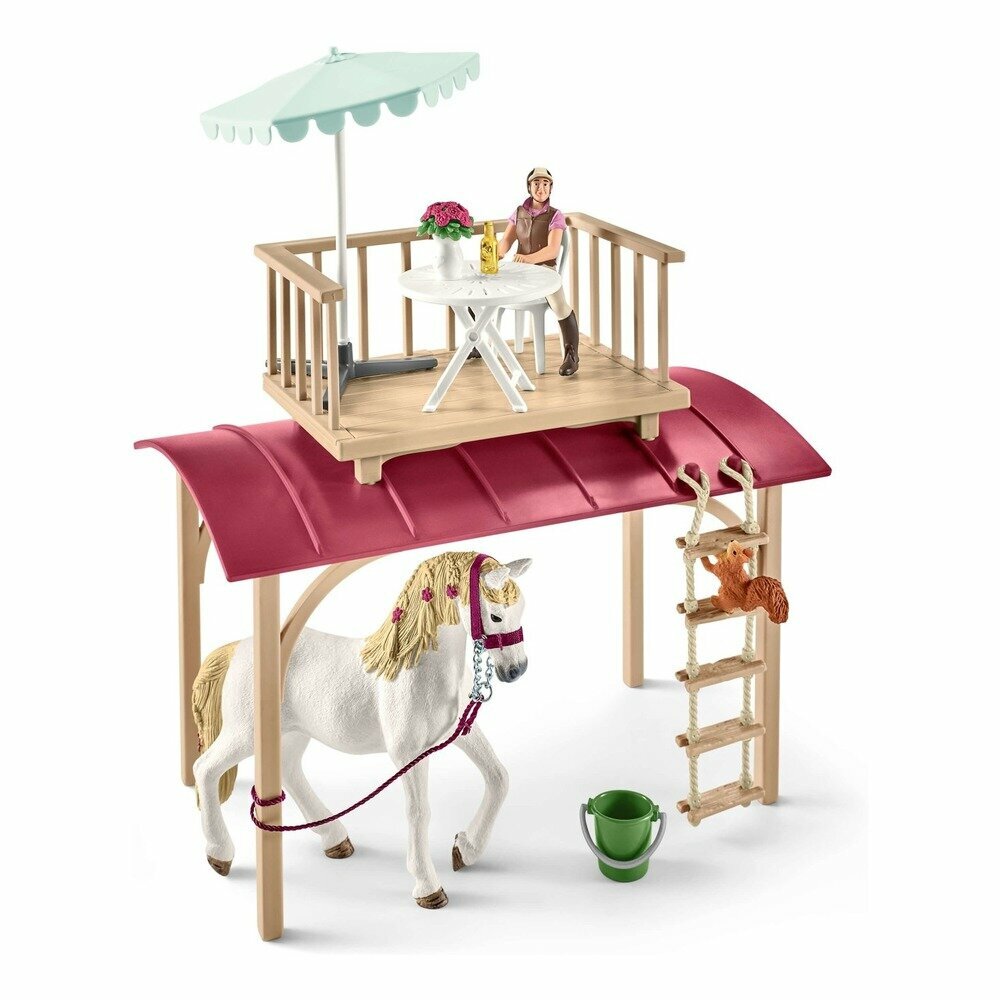 | Состав набора | Девочка, Кобыла андалузской породы, Белочка, Фургон, 2 цветных фонарика, Лестница, Стул, Зонтик от солнца, Стол для террасы, диван, стол для жилой комнаты, лампа, ящик с цветами, веревочная лестница, 2 ленты победителя, седло, уздечка, повод, недоуздок, ясли, скребница, чесалка, тюк соломы, ведро, яблоко, 2 подушки, походный костер, бутылка, 2 шампура с колбасками, 2 чашки, 2 стакана, ключ, горшечное растение, 3 пня, набор наклеек, инструкция по сборке. |