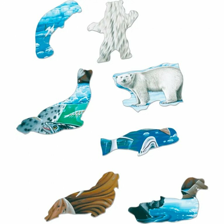 Ребенок узнает, как выглядит северная олуша и другие забавные птицы, белый медведь, гренландский кит, белуха, нарвал, тюлень, тупик, морж, арктический криль, арктическая медуза, лосось, полихетский червь и другие животные этого региона.