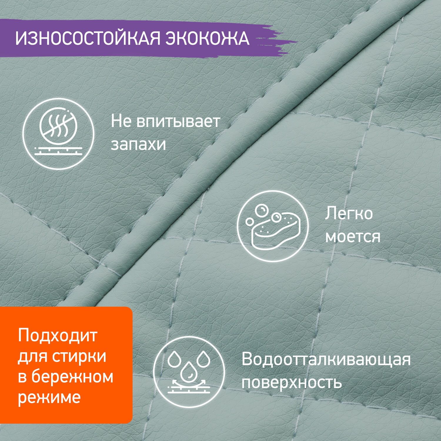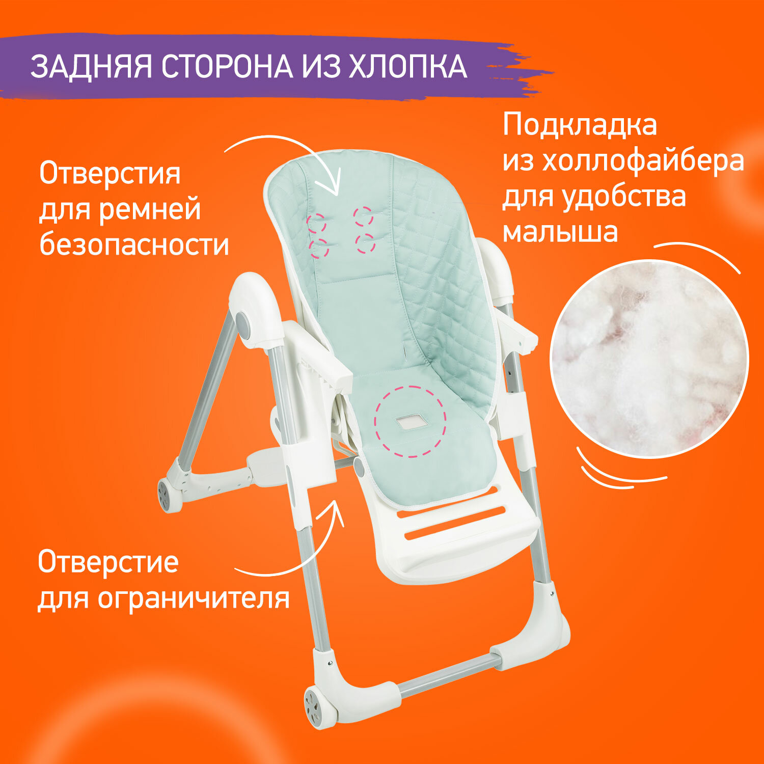 Этот аксессуар сделан из высококачественной искусственной кожи, которая не впитывает запахи, обладает водоотталкивающими свойствами и проста в уходе. Для того чтобы очистить чехол от остатков еды, достаточно просто протереть его влажной тряпкой. Экокожа – абсолютно нетоксичный гипоаллергенный материал. Она стильно выглядит, подойдет к любой модели стульчика и впишется в любой интерьер. Задняя сторона чехла выполнена из хлопка, а внутри находится тонкая прослойка из холлофойбера, чтобы малышу не было жестко сидеть на стульчике.