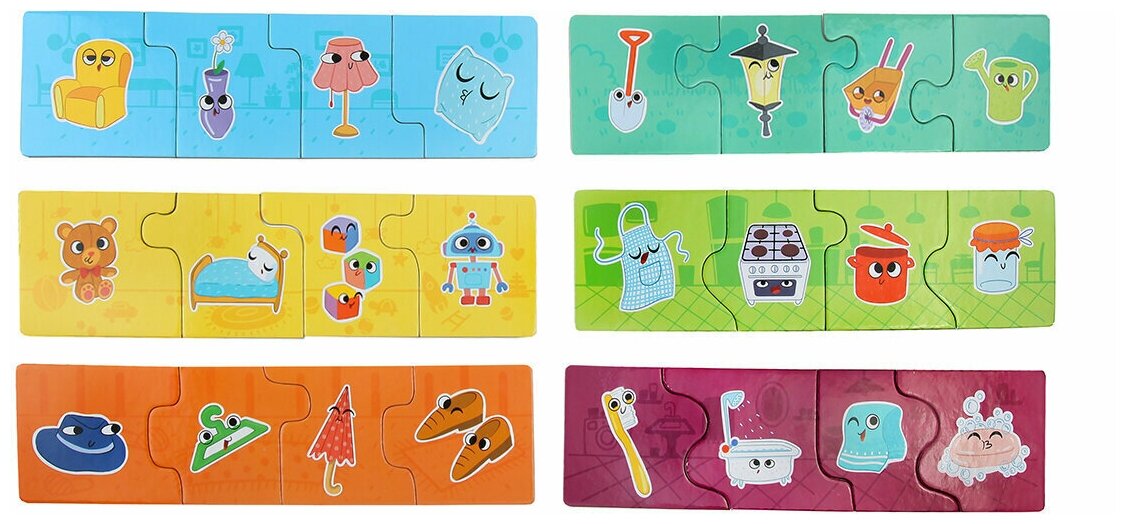 В комплекте 12 пазлов по 2 элемента большого размера из качественного плотного картона.