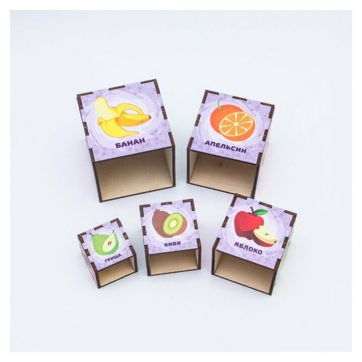 Игрушка представляет собой набор из 5 деревянных кубиков разного размера с красочными тематическими изображениями.