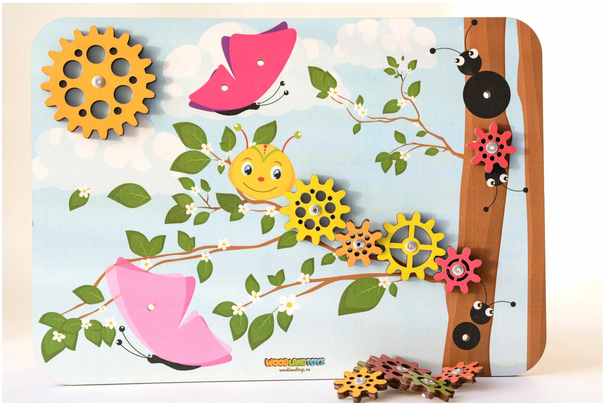 Игрушка Шестеренки— это удивительный развивающий конструктор – головоломка. Шестеренки «Природа» представляют собой деревянную доску с тематическим изображением и 11 съёмных шестеренок разного размера и цвета.