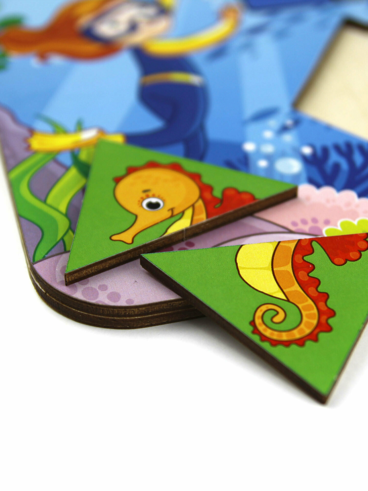 Рамка–вкладыш представляет собой красочный деревянный планшет с 6 фигурными нишами для вкладывания и набор деревянных плоских фигурок с изображением морских обитателей. В свою очередь фигуры-вкладыши делятся на половинки и четвертинки, как простейшие пазлы. Освоение геометрических фигур проходит у малышей в игре.