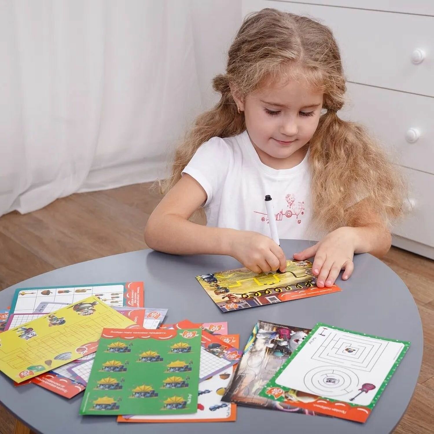 Проходите через запутанные лабиринты, ищите различия, рисуйте, штрихуйте и выполняйте множество других заданий! И все это вместе с интересной игрой «Пиши и вытирай».