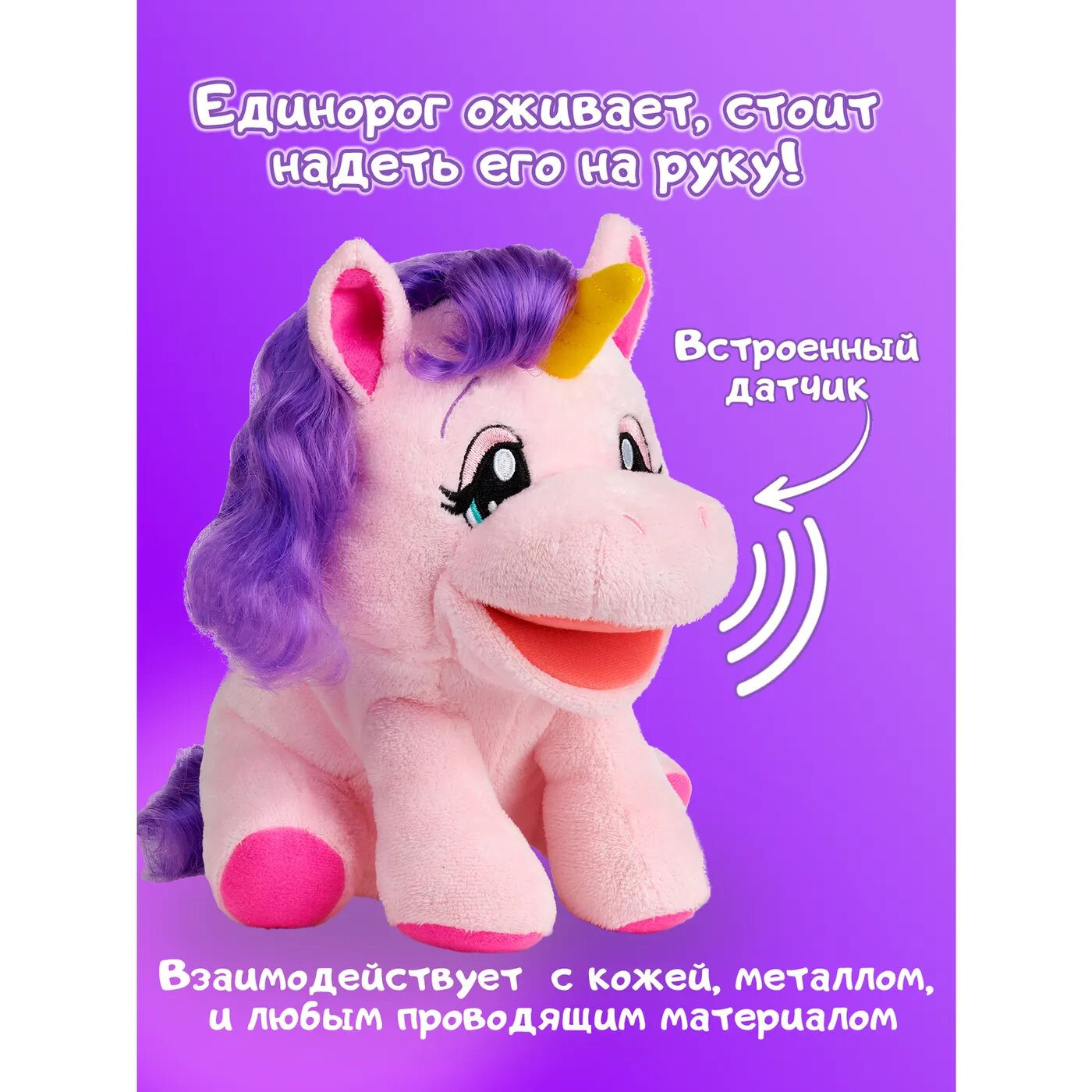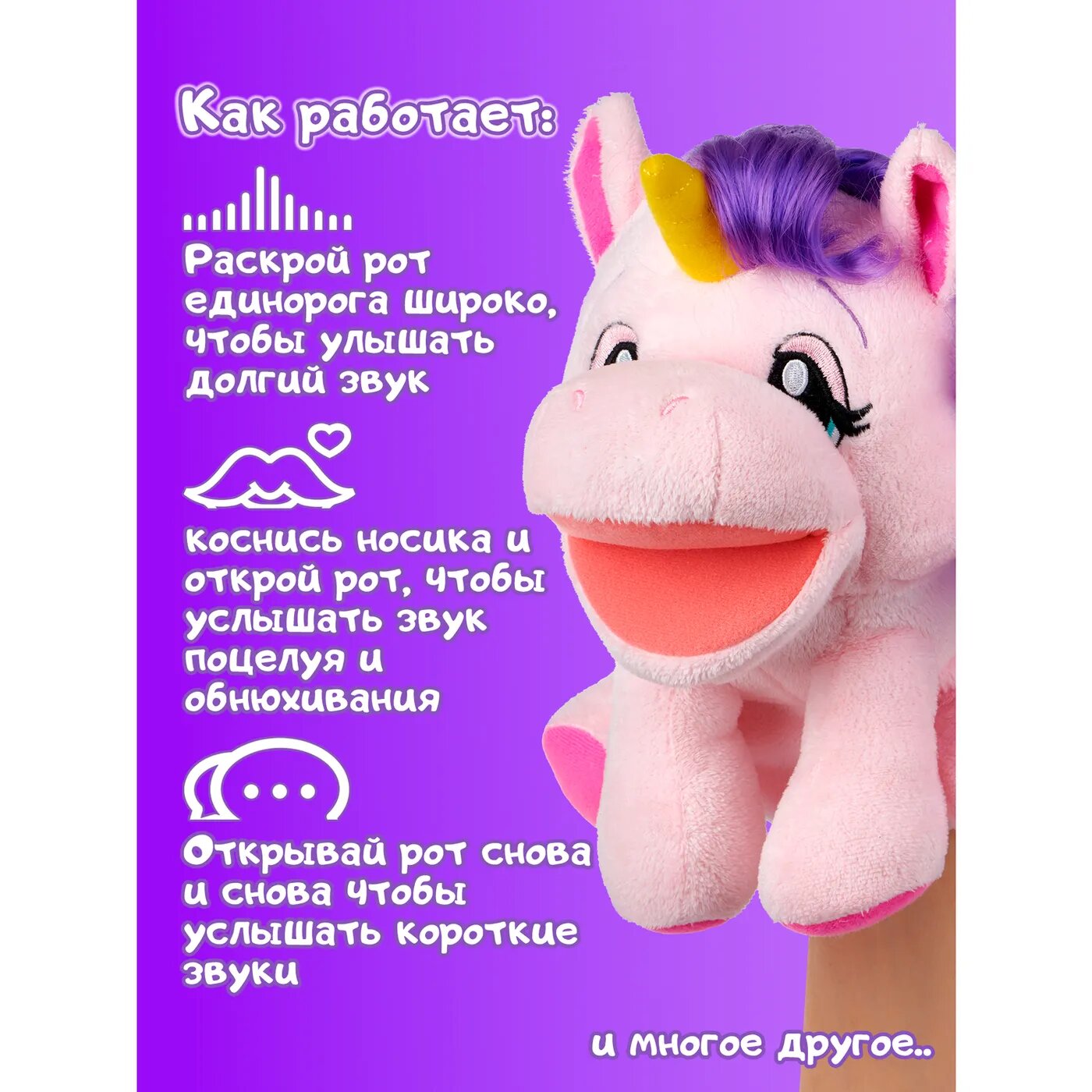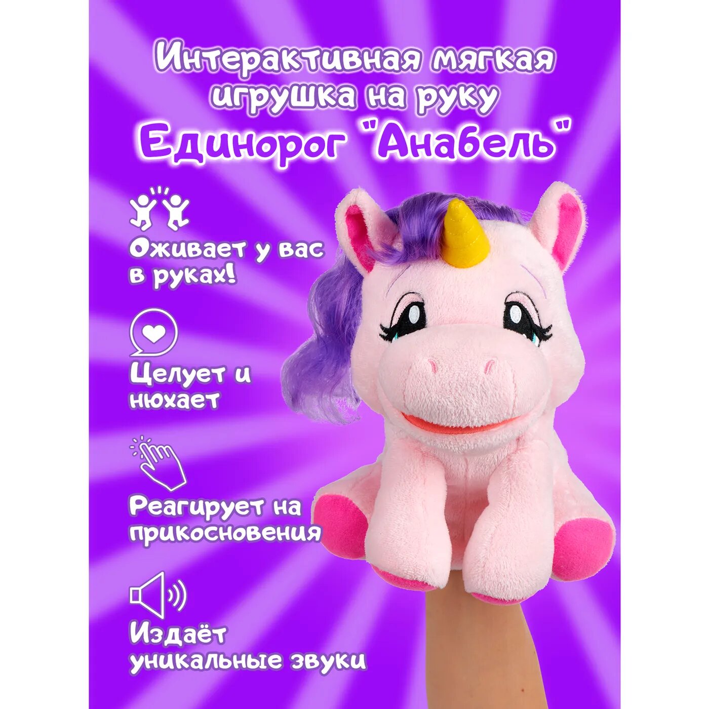 Встречайте WowWee Alive ™ Jr. Play and Say Puppet - интерактивные и говорящие куклы на руку! Единорог Анабель это очаровательная интерактивная плюшевая кукла на руку, которая издаёт уникальные звуки животных с помощью сенсорных датчиков, которые реагируют на прикосновения!
